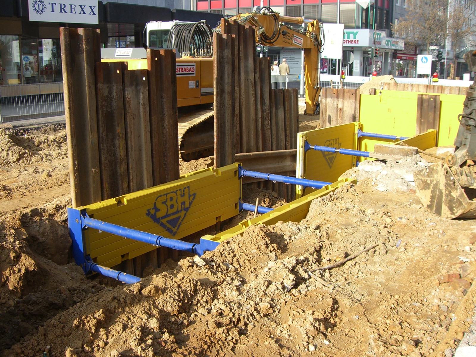 Mr_Jay-X 8 Geschrieben 19. März 2006 Autor Geschrieben 19. März 2006 (bearbeitet) Verbauboxen von SBH Tiefbautechnik Gemauerter Kanalschacht. Baugrubensicherung durch einen Dielenverbau und Stahlträgern zum sichern gegen verrutschen der Dielen im unteren Bereich Kanalgraben mit Dielenverbau bearbeitet 19. März 2006 von Mr_Jay-X Zitieren