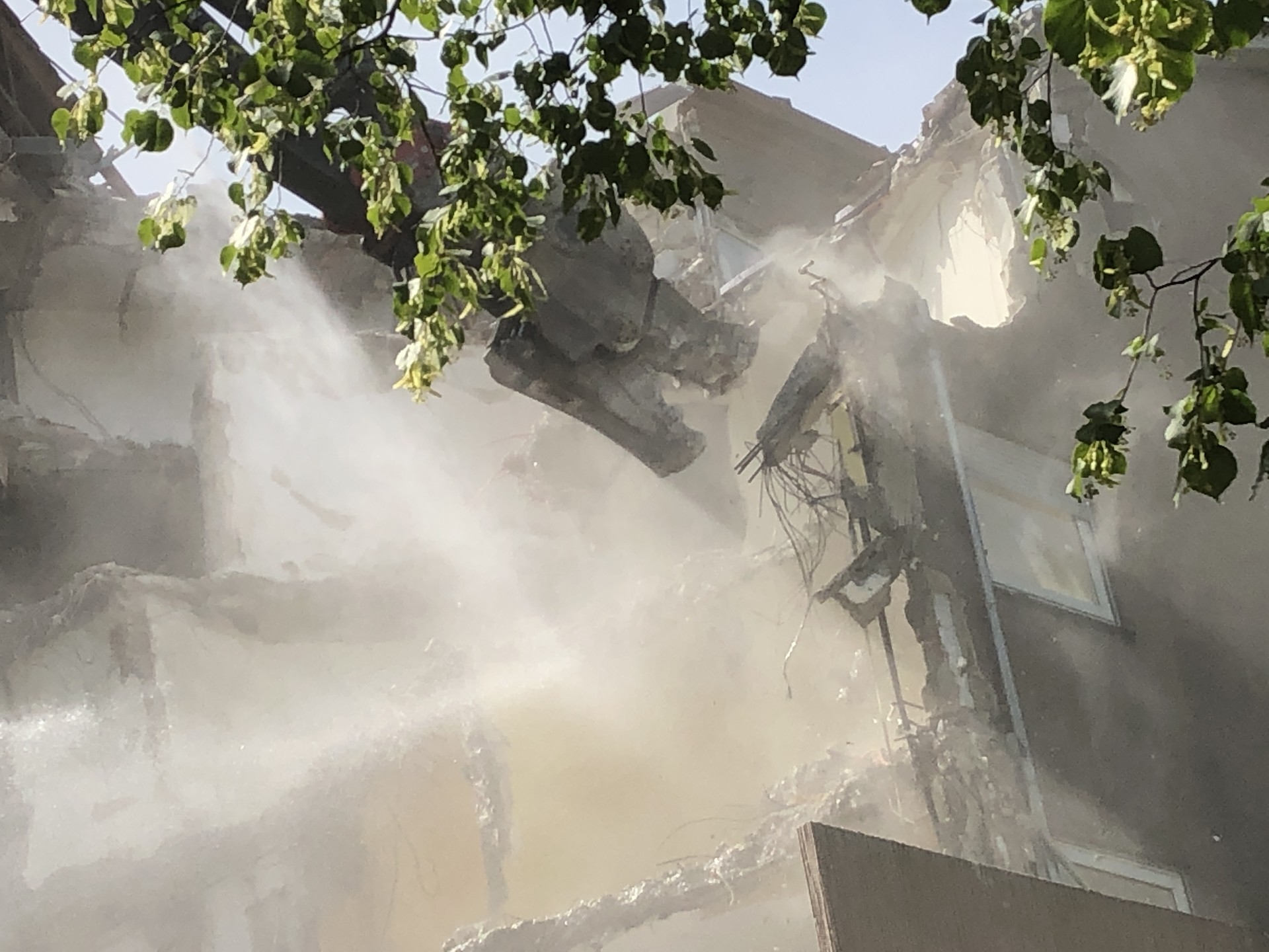 Heute morgen wurde noch eine weitere Abbruchschere und ein Pulverisierer geliefert. Insgesamt sind jetzt auf der Baustelle 3 Betonscheren, ein Pulverisierer, zwei Sortiergreifer und mehrere Baggerschaufeln. Durch den vielen Staub sind die Fotos leider nicht so gut geworden.
