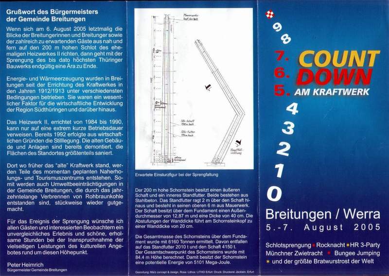 MaMu 42 Geschrieben 14. August 2005 Geschrieben 14. August 2005 (bearbeitet) Hallo zusammen! Am 06.08. hat die Eurovia-Beton Zweigniederlassung aus Suhl in Breitungen Thüringen einen 200 m Schornstein gesprengt!Anbei das Programm! bearbeitet 18. März 2009 von MaMu Zitieren