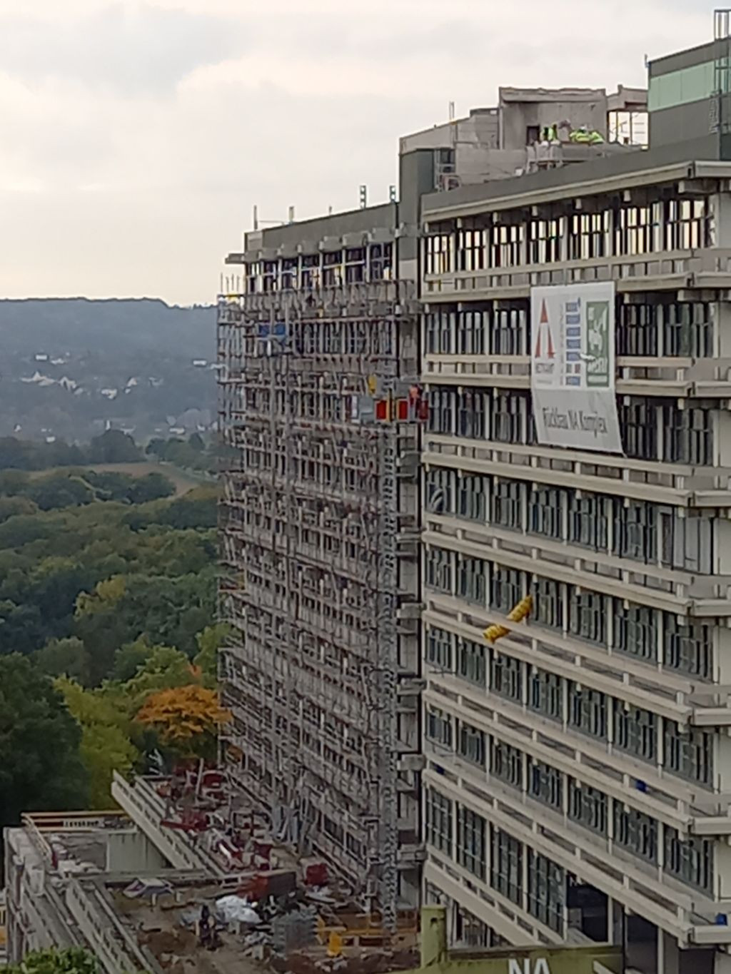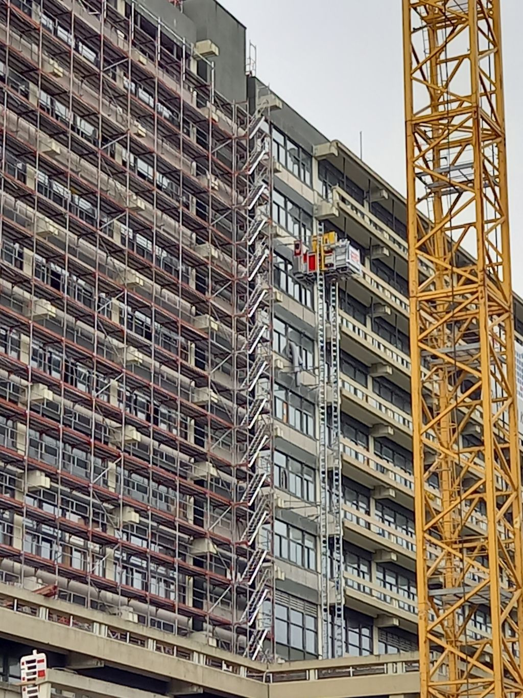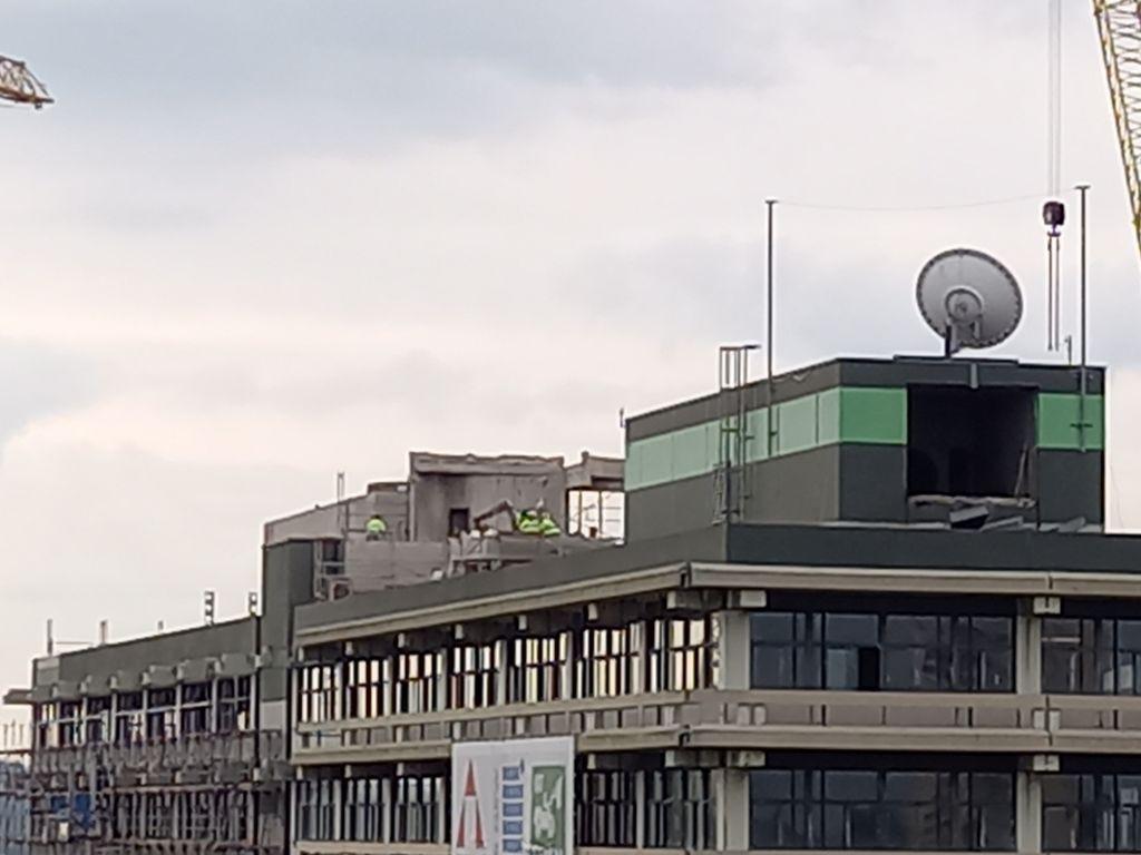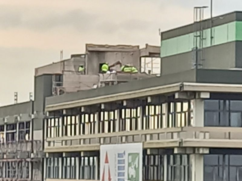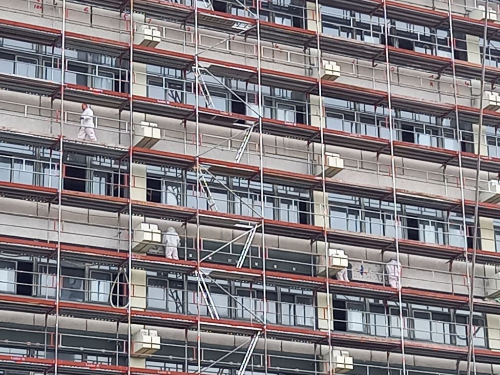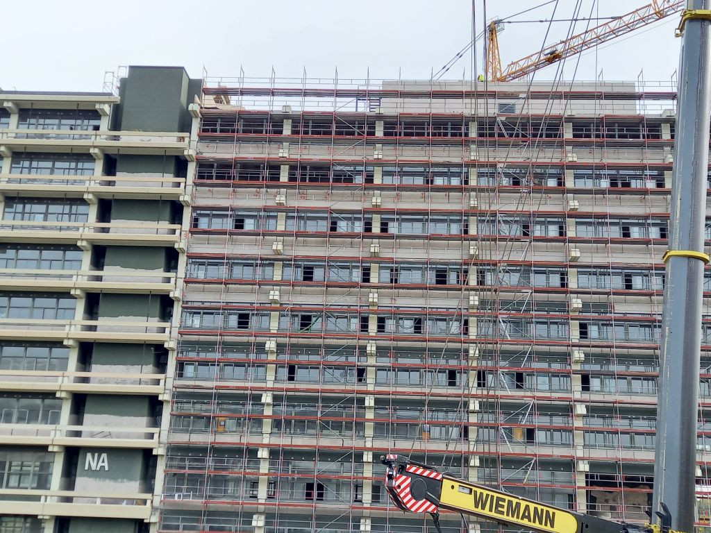 A.Briss 190 Geschrieben 13. Oktober 2022 Autor Geschrieben 13. Oktober 2022 Im Südwestteil werden jetzt die Schleifarbeiten an der PCB-haltigen Fassadenfarbe fortgesetzt und sind schon weit gediehen. Auch die belasteten Dichtungsmassen wurden weiter entfernt, so dass nun auf der zweithöchsten Ebene nahe am mittleren Treppenhaus einige weitere Fensterelemente fehlen. Zitieren
