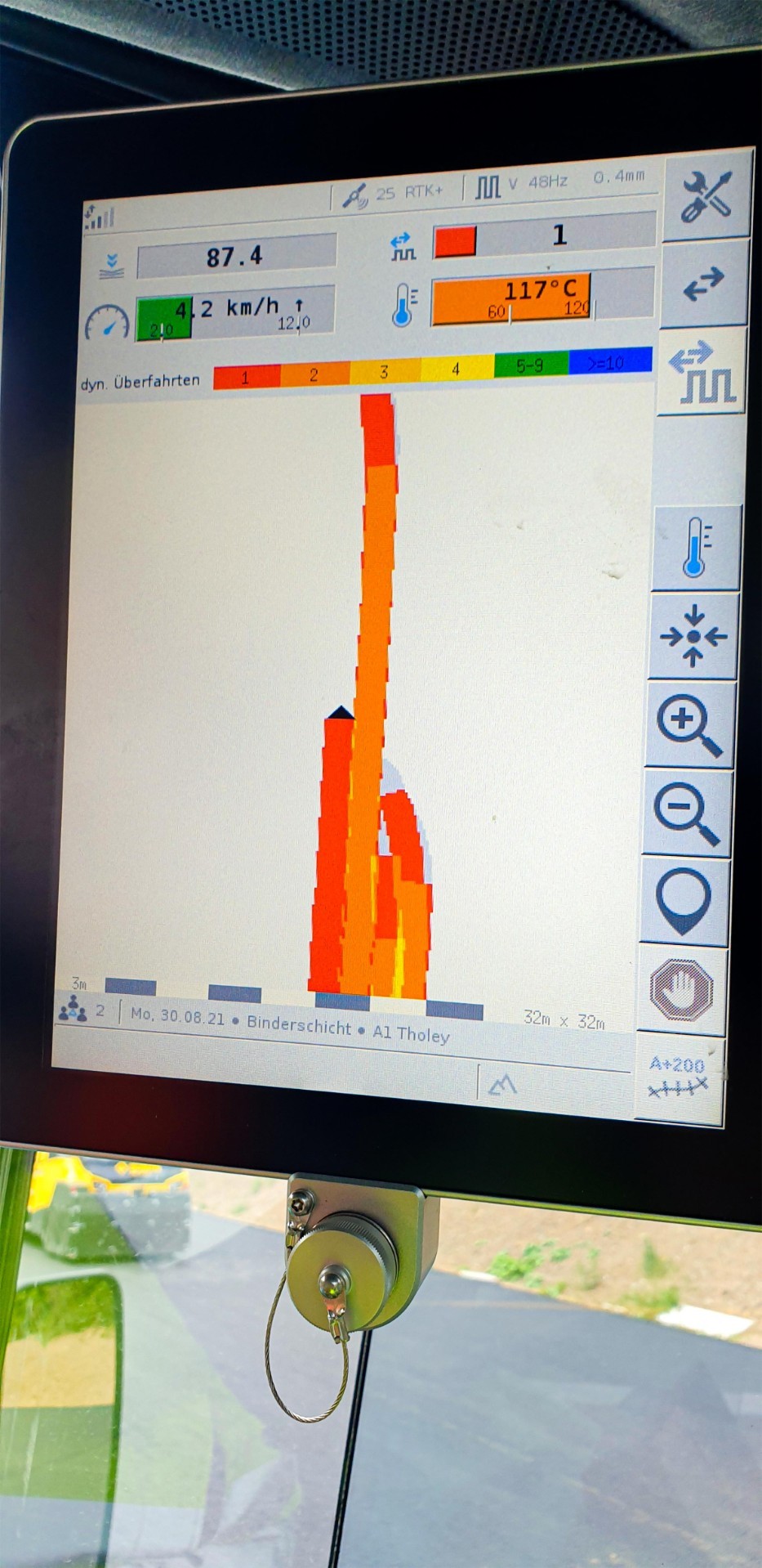 Darüber hinaus ist es für den Bediener von großem Vorteil, dass er den Verdichtungsfortschritt der gesamten Fläche auf einem Display in Echtzeit und auch die Werte und Überfahrten der anderen Walzen angezeigt bekommt. Das verhindert Schäden und steigert die Produktivität.