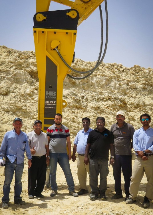 Der Hammer HB 10000 kommt bei primärer Gesteinsgewinnung von hartem Kalkstein zur Anwendung, der im Steinbruch in Dammform angeordnet ist. Hier herrschen äußerst schwierige Bedingungen, nicht zuletzt extreme Umgebungstemperaturen von bis 51 °C.
