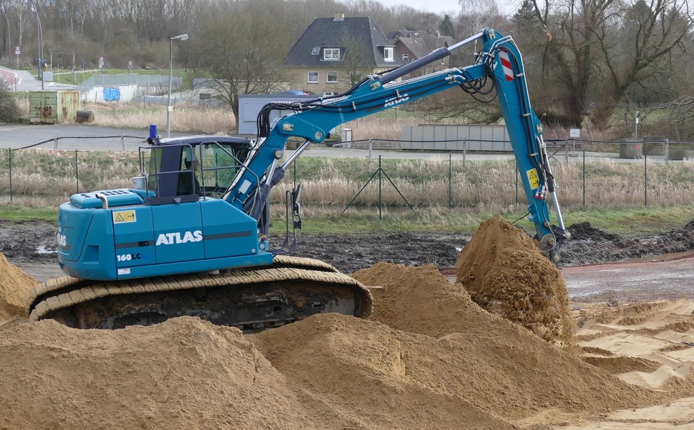Ganderkesee, 02.03.2022 - Wenn man von der A 7 bei Hamburg Richtung Moorburg abfährt, ist man nach einigen Metern aus der Stadt in einer anderen Welt angekommen. Sie besteht aus Obstplantagen und Moorwiesen und liegt geschützt hinter dem Deich. Hier ist der ATLAS 160 LC, speziell ausgerüstet für Einsätze auf wenig tragendem Untergrund, bei der Arbeit. Der 95 kW/130 PS Motor liefert die nötige Kraft für die sensible AWE-5-Hydraulik. Sie stellt eine Fördermenge von 240 l/min bei 350 bar Betriebsdruck zur Verfügung.