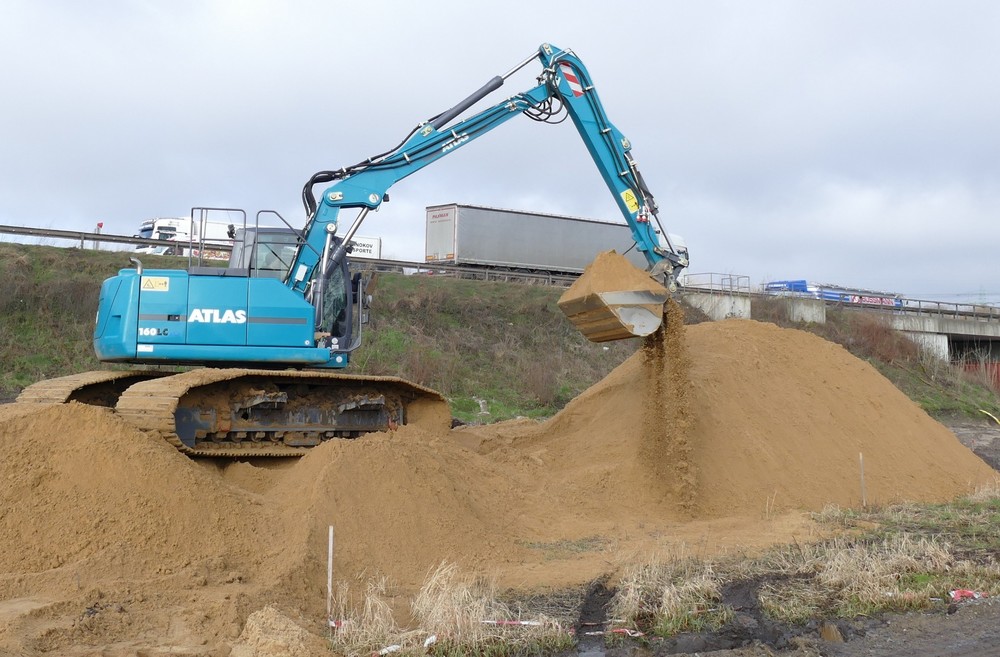 Der ATLAS 160 LC mit 5 m langem Laufwerk und 1.000 mm Bodenplatten bereitet die Sanierung eines Regenwasserauffangbeckens an der A 7 vor.