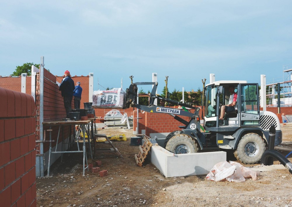 Im Dezember 2015 wurde mit den Arbeiten auf dem 17.000 Quadratmeter großen Areal begonnen – im September dieses Jahres soll die Anlage schlüsselfertig übergeben werden. Die Maschinen von HKL übernehmen bei dem Reithallenbau vielfältige Aufgaben: Eine Teleskopmaschine transportiert unter anderem schwere Betonpfeiler. Diese werden mit Anschlagketten an die Maschine gehängt, zu ihrem Bestimmungsort gefahren und dort aufgestellt. Sie bilden das Gerüst von Halle und Stallgebäude. Sobald dieses steht, werden zwischen den Betonpfeilern Mauern gezogen. Dafür nutzt Viebrockreithallen spezielle Klinkersteine, die zum Schutz der Pferde an den Kanten abgerundet sind und eigens für das Unternehmen gebrannt werden. Ein Radlader aus hilft beim Transport der Steine. Container stehen während der gesamten Bauzeit als Mannschaftsraum bereit.