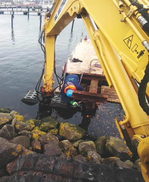 Kiel, 05.03.2020 - Ein Yacht- und Fischereihafen an der Nordostküste der Kieler Förde wird saniert. Berke WMB Technik GmbH & Co. KG. (Berke) verantwortet hier den ersten Bauabschnitt und vertraut dabei auf das Sortiment und den Service von HKL. Zur Begradigung der Mole und Erneuerung des ersten Steges mietet der Wasserbauspezialist einen Kompaktbagger – Stromaggregat, Bauwagen und Baustellenzubehör werden ebenfalls von HKL bezogen.