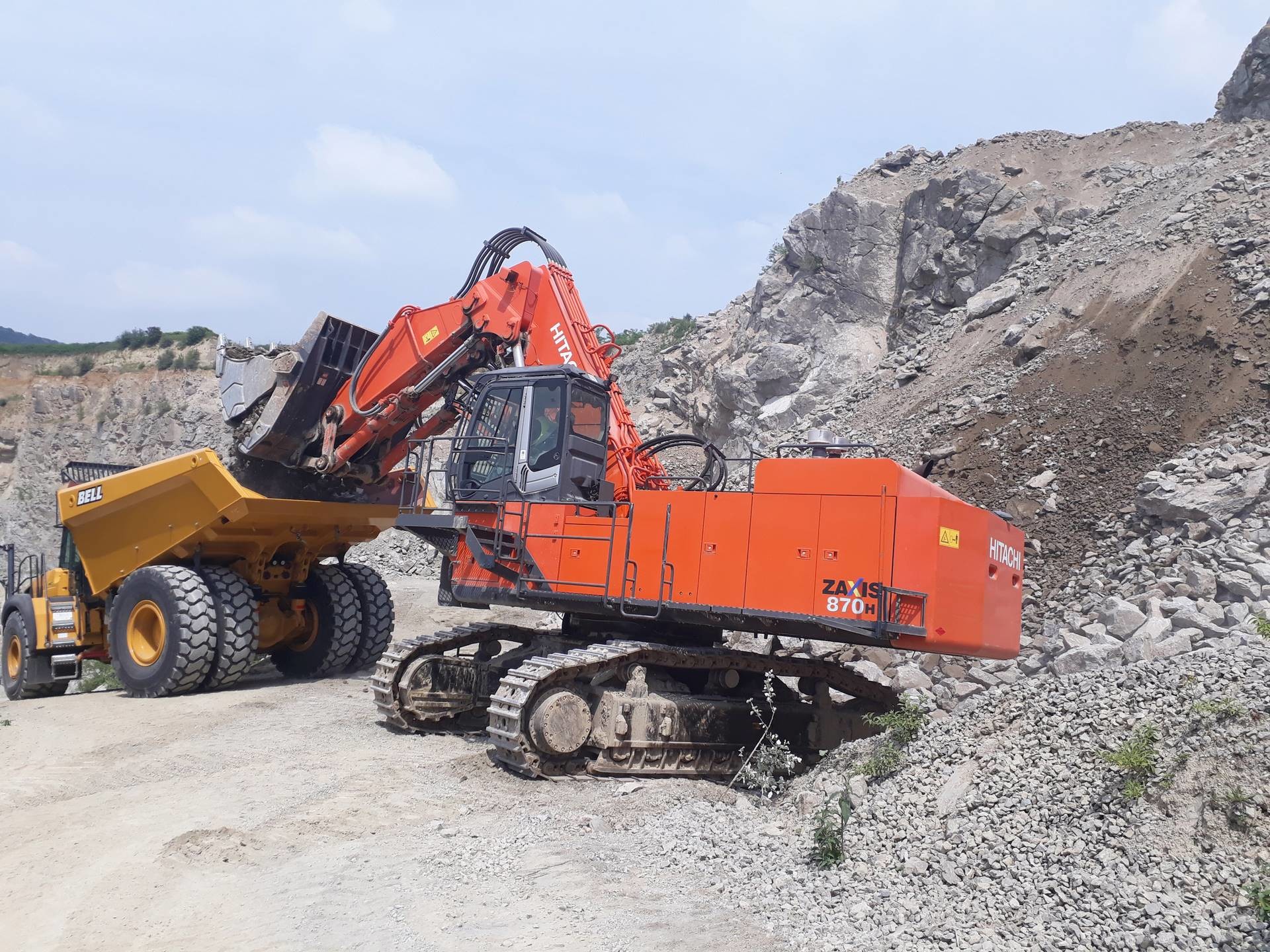 Tatkräftige Unterstützung erhält das Hauri-Team dabei vom Hitachi ZX870-3. Zusammen mit dem Bell B60E Muldenkipper bildet der Raupenbagger ein echtes Dreamteam für die Gewinnung. „Wir sind wirklich sehr zufrieden mit der Kombination“, bestätigt Marcus Hauri. Als Produktionsleiter verantwortet der Enkel des Firmengründers den reibungslosen Ablauf vor Ort. Ausfallzeiten und häufige Wartungsarbeiten kann er in seinem Steinbruch nicht brauchen, weshalb er auf die Kompetenz und Serviceleistung von Systempartner Kiesel vertraut. „Wir haben es noch nie gebraucht, aber im Zweifel wären die in 15 Minuten hier, das weiß ich.“