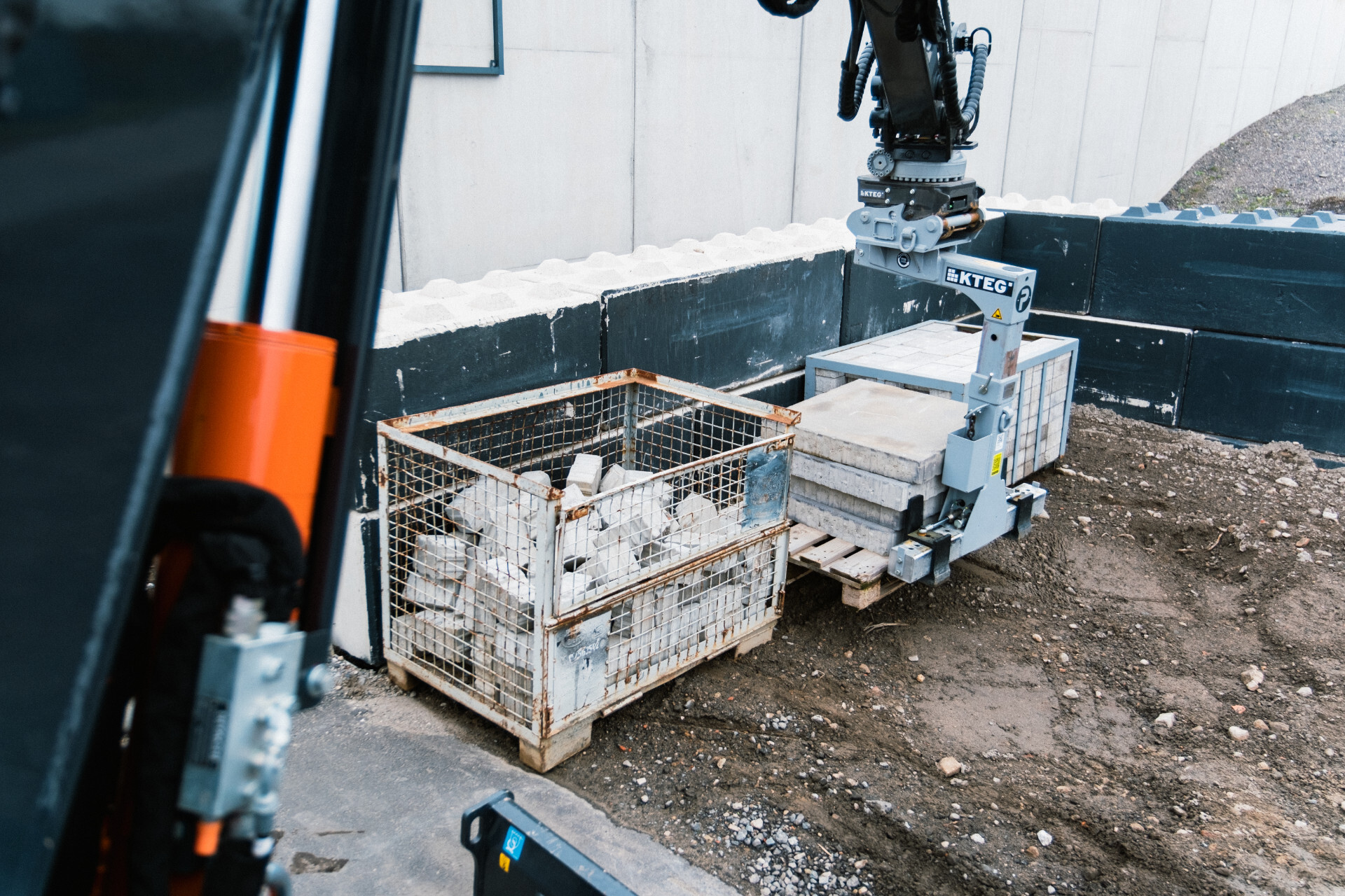Die KTEG 360° Powerfork ermöglicht das Heben, Stapeln sowie Be- und Entladen direkt mit dem Bagger. In nur 10 Sekunden ist sie auf Knopfdruck dank des vollhydraulischen Rotationsschnellwechslers KTEG OQR eingekuppelt und sofort einsatzbereit. Dabei ist keine zusätzliche Arbeitskraft nötig – und damit muss sich auch keine weitere Person im Gefahrenbereich aufhalten.