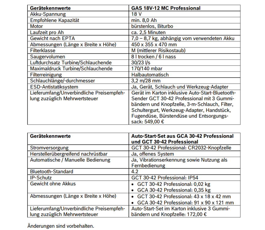 Der Nass-/Trockensauger GAS 18V-12 MC Professional und das Auto-Start-Set sind ab sofort erhältlich. Die Preise verstehen sich als unverbindliche Preisempfehlung zuzüglich Mehrwertsteuer.
