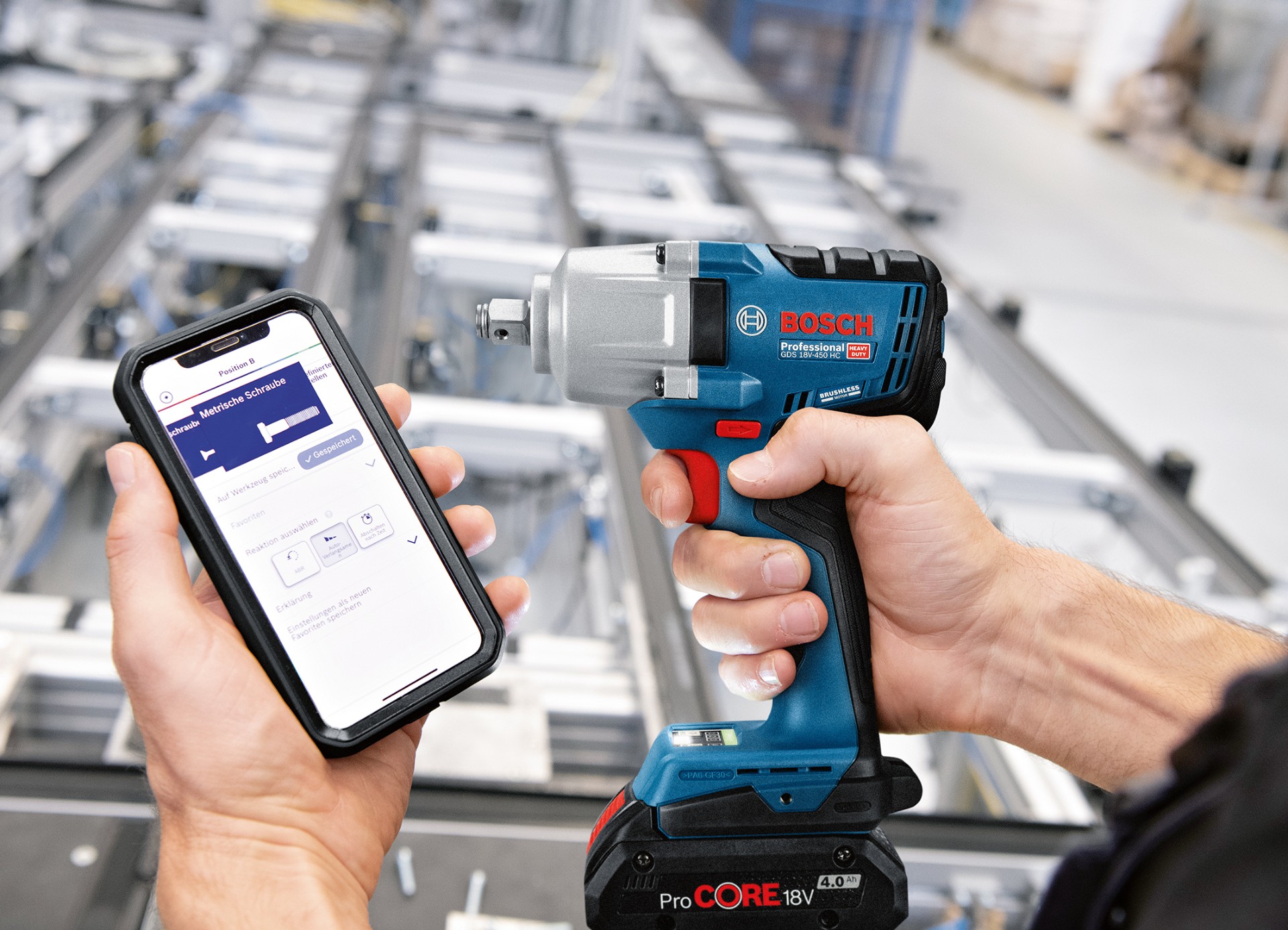 Der GDS 18V-450 HC Professional ist kompakt und bequem zu bedienen: Er hat eine Kopflänge von 169 Millimetern und wiegt ohne Akku nur 1,6 Kilogramm. Den Akku- und Werkzeugstatus haben Profis durch die integrierte LED auf dem User Interface nach dem Ampelprinzip „Grün, Gelb, Rot“ jederzeit im Blick. Der Drehschlagschrauber bietet darüber hinaus zwei Schraub-Modi, die per App weiter konfiguriert werden können. Auf diese Weise verhindert der GDS 18V-450 HC Professional Schäden an Schrauben und Oberflächen ‒ das unterscheidet ihn maßgeblich von gängigen Drehschlagschraubern seiner Klasse im Markt.![]()