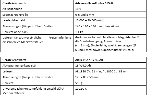 Der AdvancedTrimRouter 18V-8 ist ab Februar 2022 erhältlich. Umfangreiches Zubehör wie verschiedene Fräser-Sets, zum Beispiel mit Nuten-, Gravur- und Kantenfräsern, gibt es im Bosch-Zubehörprogramm. Alle genannten Preise verstehen sich als unverbindliche Preisempfehlung einschließlich Mehrwertsteuer.