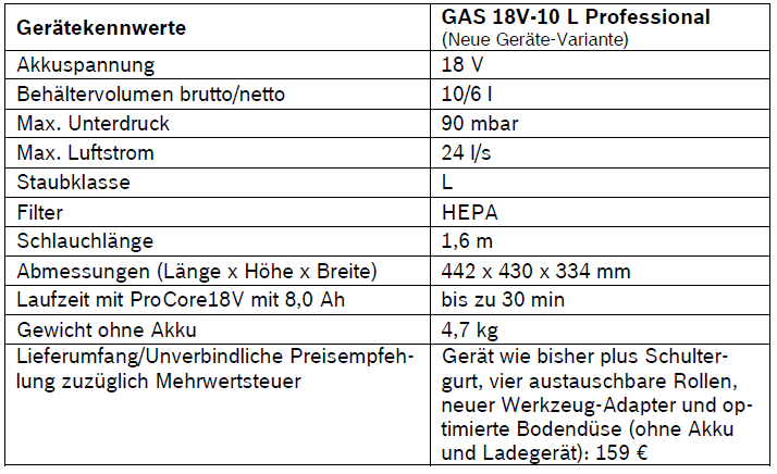 Der optimierte Akku-Sauger GAS 18V-10 L Professional ist ab sofort erhältlich, die Akku-Staubabsaugung GDE 18V-26 Professional ab Mai 2020. Die Preise verstehen sich als unverbindliche Preisempfehlung zuzüglich Mehrwertsteuer.