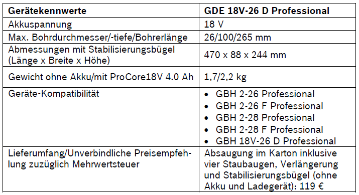 Die Absaugung eignet sich auch besonders für Profis, die oft von Baustelle zu Baustelle unterwegs sind: Sie sparen sich den zusätzlichen Sauger. Mitgeliefert werden vier Staubaugen für unterschiedliche Anwendungen: zwei für kleinere Bohrdurchmesser von vier bis 16 Millimeter sowie zwei für größere bis 26 Millimeter, jeweils für Geräte mit Fest- oder Wechselfutter. Aufgesteckt werden kann bei Bedarf auch eine Verlängerung, sodass Bohrer bis 265 Millimeter Länge eingesetzt werden können. Die GDE 18V-26 D Professional deckt damit im Vergleich zu gängigen Wettbewerber-Modellen das breiteste Anwendungsspektrum hinsichtlich Bohrdurchmesser, -tiefe und Bohrerlänge ab.