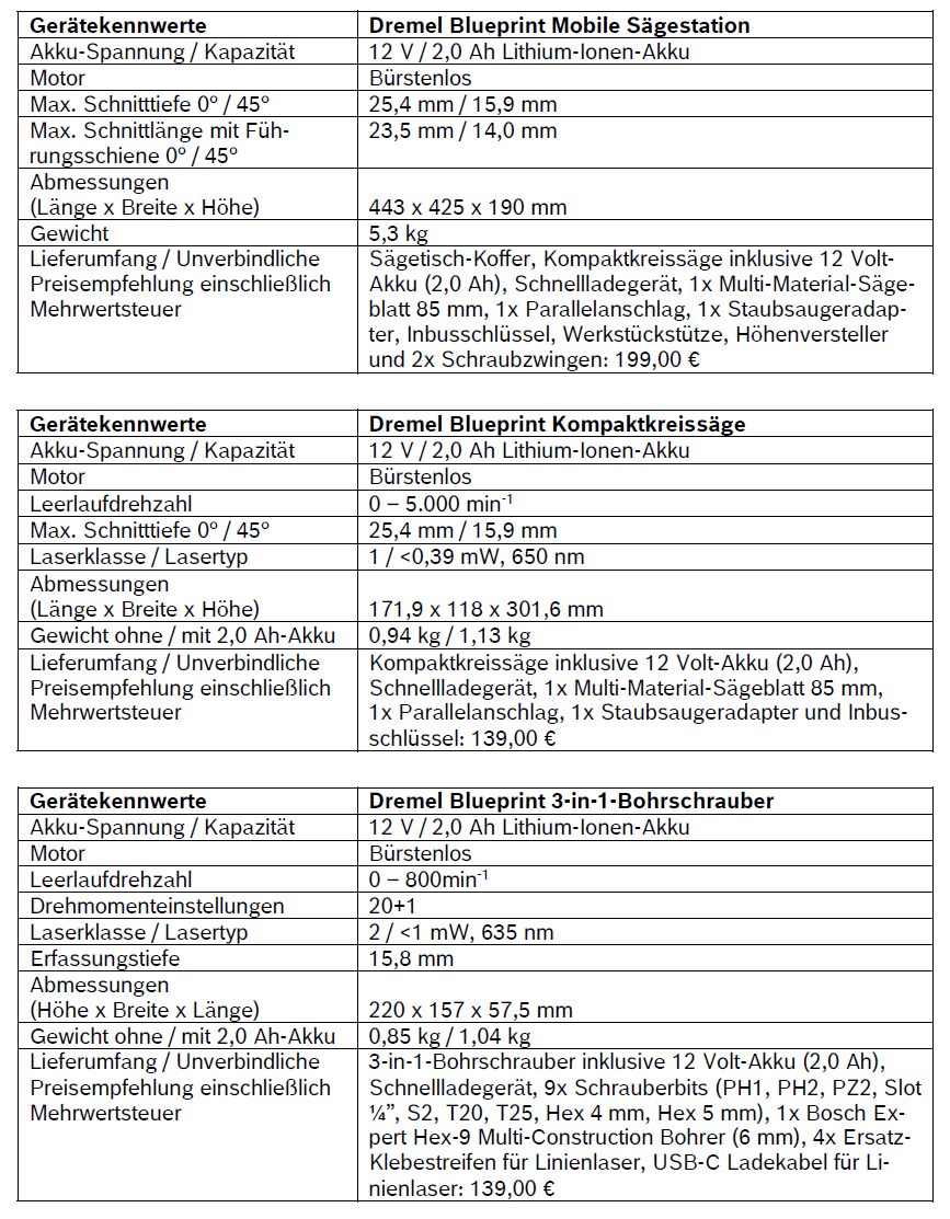 Die mobile Sägestation, die Kompaktkreissäge, die Sägeblätter und der 3-in-1-Bohrschrauber sind ab April erhältlich. Die genannten Preise verstehen sich als unverbindliche Preisempfehlung einschließlich Mehrwertsteuer. Die Dremel Blue-print-Linie soll sukzessive ausgebaut werden.