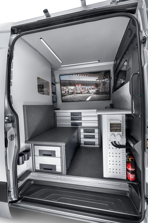 Der Heckbereich des zweigeteilten Mercedes-Benz Sprinters dient als mobile Werkstatt.