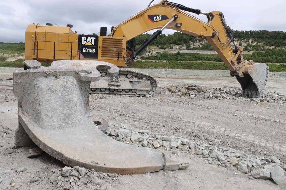 München, 09.09.2022 - Ein Schwergewicht hat seit Herbst 2020 den Rohstoffabbau von Kalkgestein im Lengericher Steinbruch Hohne übernommen. Aufgrund seiner Größe zählt er zu einem eher seltenen Exemplar in Deutschland. Der 140 Tonnen schwere Tieflöffelbagger vom Typ Cat 6015B muss im Steinbruch für genügend Nachschub im angrenzenden Zementwerk sorgen. Hier werden jährlich etwa 1,8 Millionen Tonnen von dem Schlüssel-Baustoff der Baubranche hergestellt.