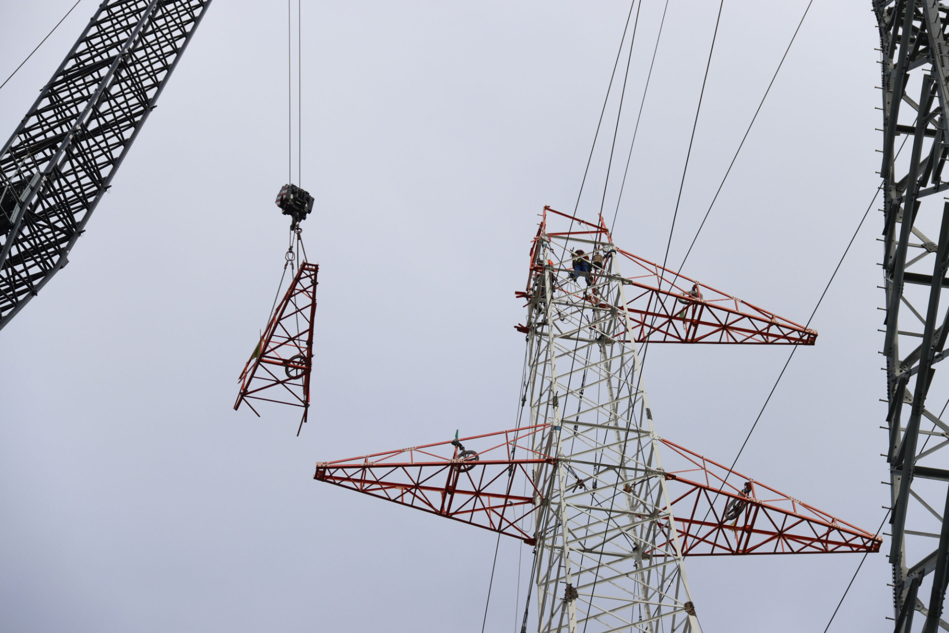 Duisburg - An die knapp hundert Meter über dem Boden, wo der Wind durch die Stahlträger pfeift und der Blick über den Rhein reicht, sind Industriekletterer vom Forstunternehmen E. Krobbach im Auftrag für das Unternehmen Cteam in ihrem Element, um einen von rund 40 Hochspannungsmasten für den Energieversorger Amprion bei Duisburg zu demontieren.