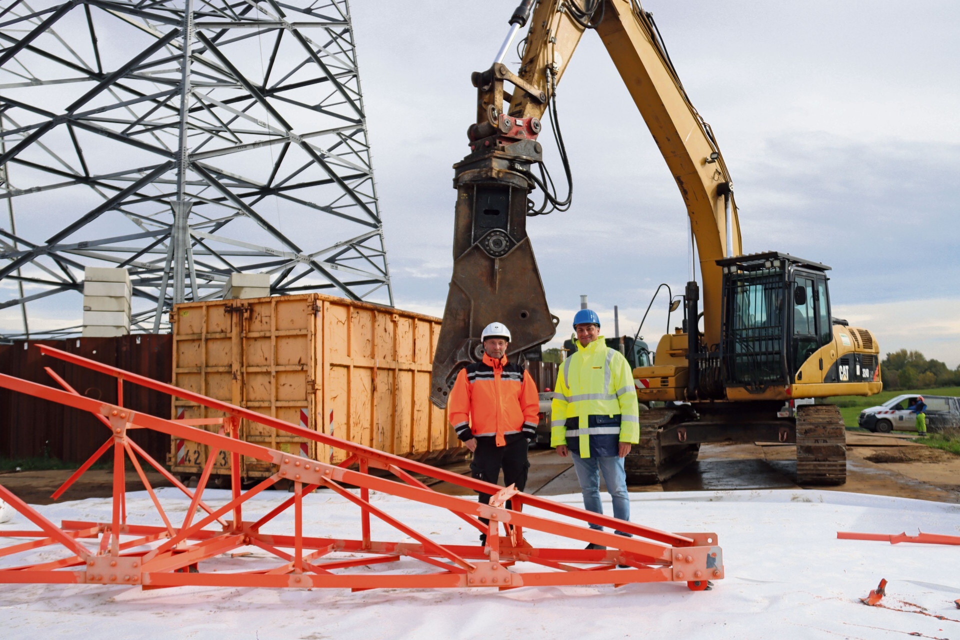 Um den alten Mast, der durch einen neuen ersetzt wird, zu Fall zu bringen, ist er an einem 650-Tonnen-Autokran befestigt. Kletterer durchtrennen erst die Mastspitze mit einer Flex, dann die sechs Traversen und später geht es an den Stamm, der Stück für Stück entfernt wird. Jedes Stück wird mithilfe des Autokrans von oben nach unten auf eine Fläche, ausgelegt mit Vlies, gehoben. An die 500 Kilo wiegen Mastspitze und 900 Kilo die Traversen, die am Kranhaken hängen. In Empfang nimmt sie ein Cat Kettenbagger 324DLN oder ein Cat 313 mit einer Cat Schere. Diese drückt und zerlegt die Konstruktion auf eine Größe, die in den daneben platzierten Container passt. Die Entsorgung der Stahlträger ist strikt geregelt – jeder Container erhält eine Nummer, um die Menge des zu entsorgenden Stahls pro Mast nachverfolgen zu können. Manche Masten fußen auf teerhaltigen Bahnschwellen. Außerdem kann es vorkommen, dass Masten einen grauen Farbton erhalten, der bleihaltig und heute längst nicht mehr Standard ist. Zerschneidet der Bagger den Stahlträger, splittert zwangsläufig die bleihaltige Beschichtung. Deswegen dient das Vlies auf der Arbeitsfläche als Schutz und Vorsichtsmaßnahme, damit die Farbsplitter nicht auf dem Boden landen, sondern hinterher eingesammelt und getrennt entsorgt werden können.