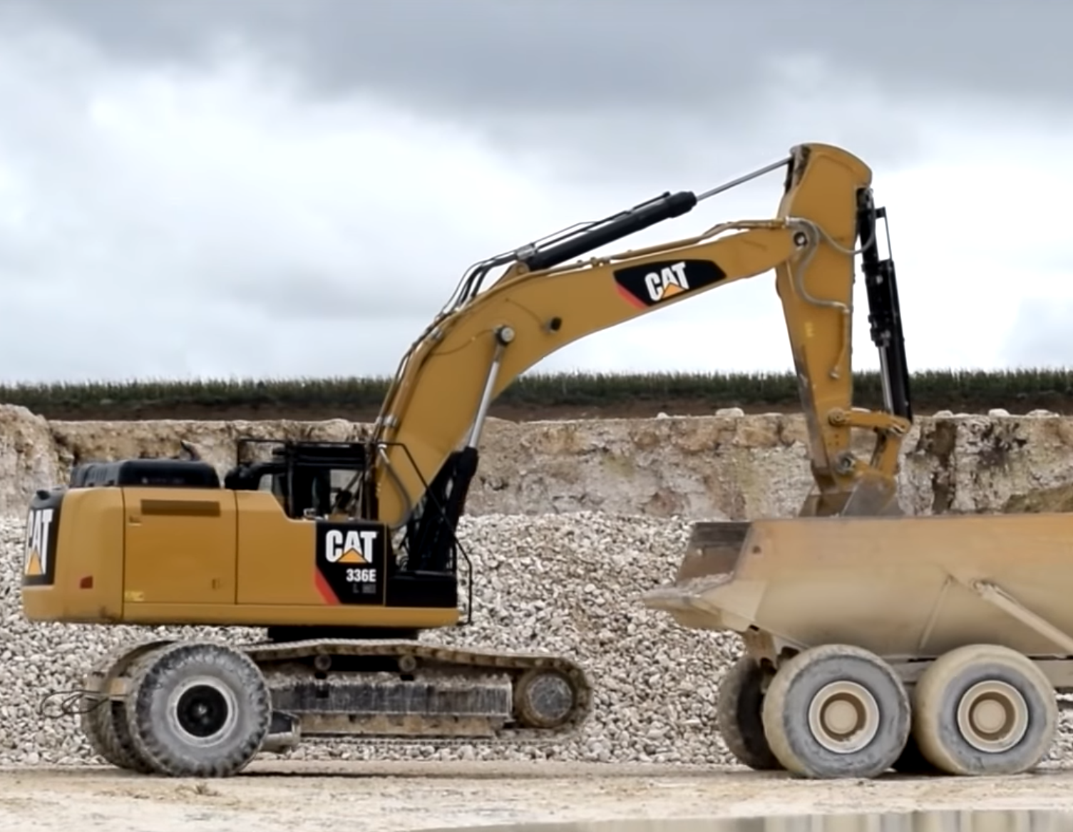 Den Rohstoff mit den Farbnuancen gelb bis weiß – das weckt Assoziationen mit weißem Gold – verlädt der neue Cat 352F L auf Dumper. Der Baggerfahrer, Michael Graf, einer von 19 Mitarbeitern im Tagebau, muss schon beim Abbau ein genaues Auge haben, mit welchem Material er den rund drei Kubikmeter großen Löffel füllt. „Schon hier beginnt das Aussortieren der Kieselerde. Die Maschine muss darum sehr feinfühlig agieren“, so Dr. Schmidt. Außerdem sollte sie eine möglichst geringe Bodenbelastung aufweisen, um nicht einzusacken – aus diesem Grund wurde ein langes Laufwerk mit breiten Bodenplatten gewählt. Die knickgelenkten Muldenkipper befördern den Rohstoff dann auf eine rund sieben Hektar große Haldenfläche auf einem Feld bei Rennertshofen, auf dem derzeit die abgebaute Kieselerde bis zur Weiterverarbeitung zwischengelagert wird.