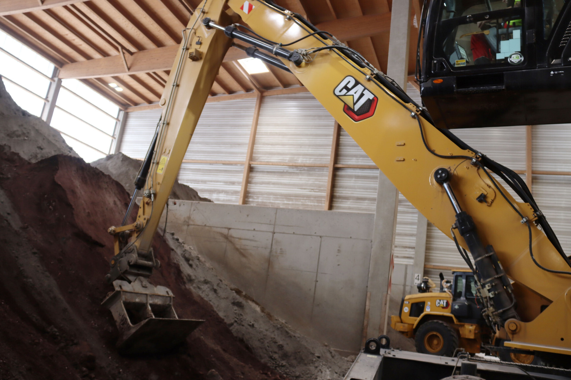 Der Cat Umschlagbagger MH3026 erhielt ein besonderes Anbaugerät, das einem Schaber ähnelt und das Material aus den Lkw-Mulden auskratzen soll. Es funktioniert aber auch wie eine Maurerkelle, um mit dem Umschlagbagger das Material in der Halle 2A aufzuhalden.