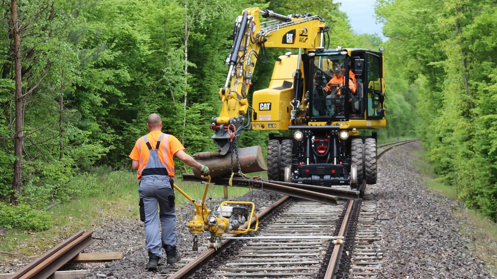 Dazu gehören die Inspektion, Wartung, Instandhaltung und Erneuerung aller Anlagen rund um das Gleis, um einen funktionierenden Bahnbetrieb sicherzustellen. Doch dabei dreht sich nicht nur alles rund um die Schienen, die Schwellen und den Schotter, sondern auch die Bereiche links und rechts neben den Gleisanlagen bis zu den angrenzenden Grundstücken sind instand zu halten. Bei diesem Pensum an Aufgaben wird die AVG Bahnmeisterei Forbach seit Kurzem von einem Cat Zweiwegebagger M323F unterstützt.
