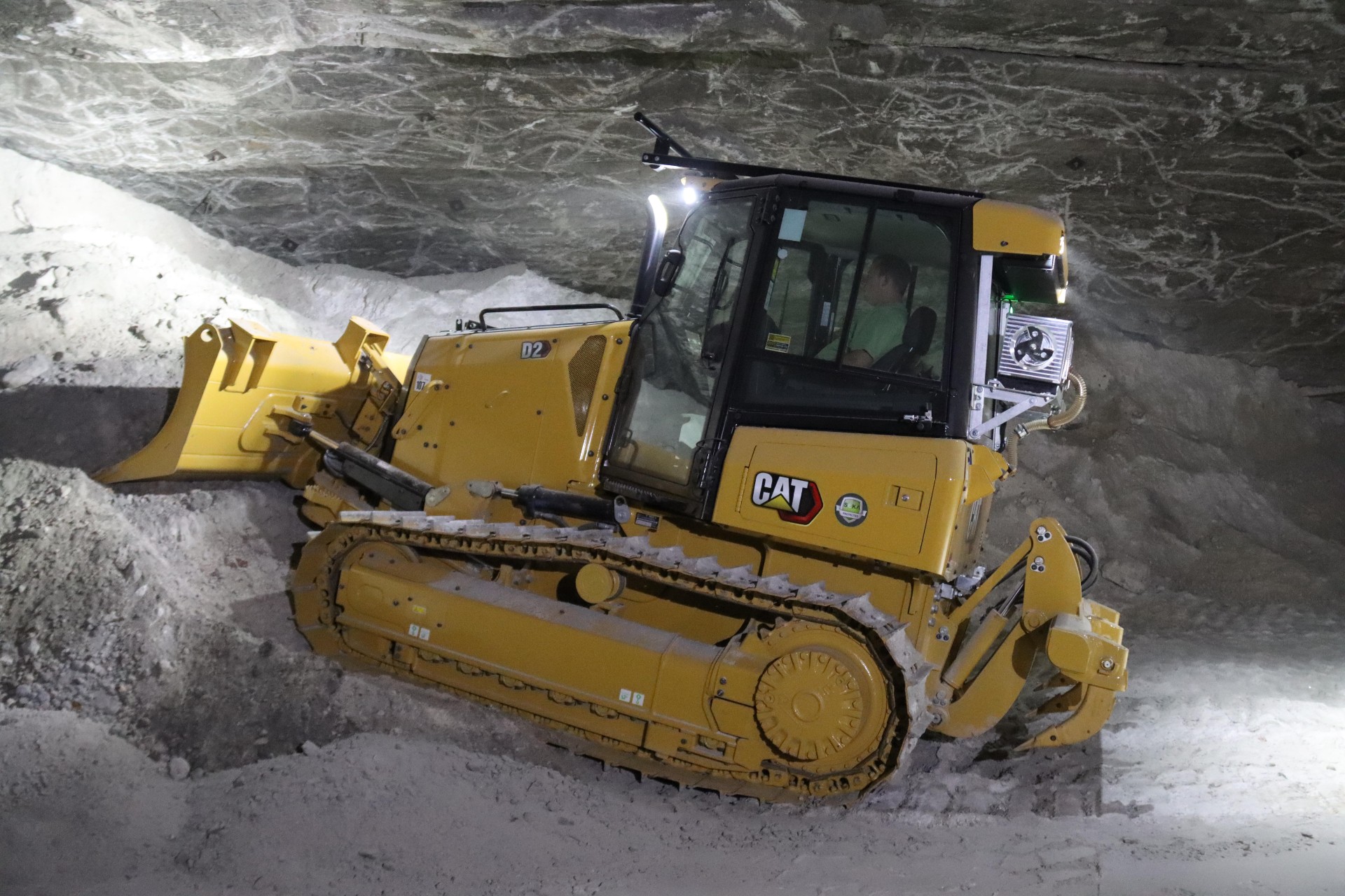 Einer der rund hundert Mitarbeiter der GTS ist Raupenfahrer Chris Lange, der in Zukunft den Cat D2 XL steuern wird. Bis er sein Arbeitsgerät erreicht, geht es für ihn Tag für Tag über den Personenförderkorb 713 Meter tief nach unter Tage. Zuvor muss er sich umziehen: Zur PSA, der persönlichen Schutzausrüstung, gehören unter anderem ein Helm mit Geleucht, Arbeitsschutzschuhe und Augen- sowie Gehörschutz. Für Notfälle kann er auf seinen persönlichen Sauerstoffselbstretter zurückgreifen, den jeder Mitarbeiter unter Tage während seiner Acht-Stunden-Schicht mit sich führen muss – dieser wird in der Kabine der Baumaschine an einer dafür vorgesehenen Halterung befestigt. „Früher habe ich im Straßenbau gearbeitet. Da habe ich unter anderem schon Raupen bedient, allerdings waren die größer“, erklärt er. Das ist nicht die einzige Veränderung: Was sein neues Arbeitsgerät anbelangt, muss es wendig sein, weil er in den relativ engen Strecken und Abbaukammern nicht viel Platz hat. „Obwohl die Maschine klein ist, ist sie immer noch geräumig. Die Übersicht von der Kabine aus nach vorne auf den Dozerschild ist gut“, bewertet er die Maschine, die teilweise 3,60 Meter hohe Bergwerkstrecken passieren muss.