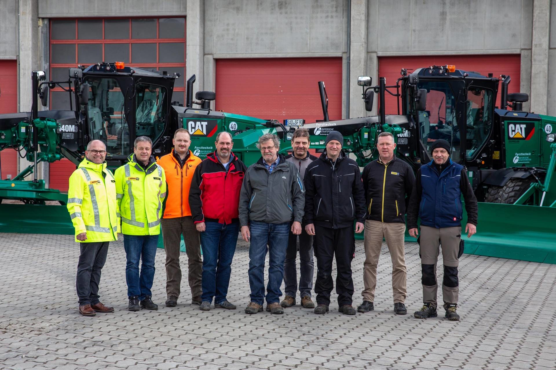 Das Fahrer-Team und die Mitarbeiter der Bayerischen Staatsforsten bekommen eine Einweisung in die Grader-Technik durch die Zeppelin Projekt- und Einsatztechnik sowie die Niederlassung Straubing