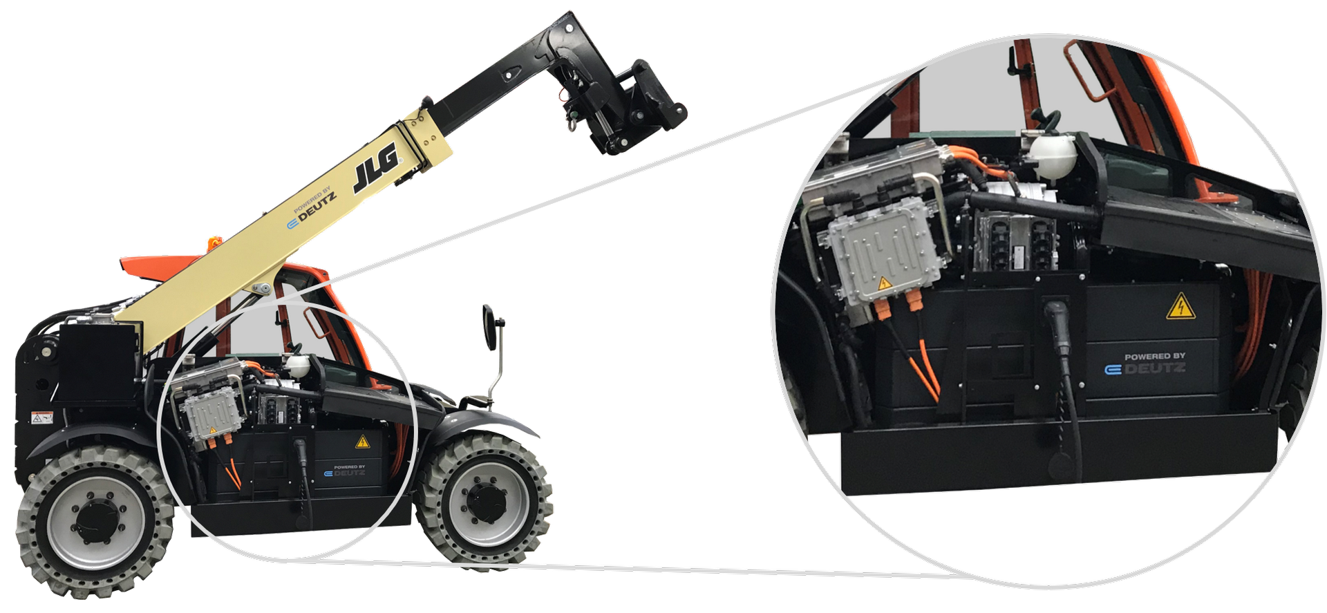 Das von DEUTZ und JLG gemeinsam entwickelte Teleskoplader-Konzept G5-18A verfügt über ein kompaktes 360-Volt-Antriebssystem mit zwei 40-kW-starken Elektromotoren – jeweils für den Fahrbetrieb und die Teleskop-Hydraulik.