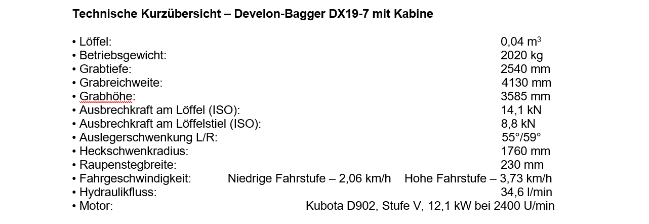 Die neue Plattformgestaltung und die neuen Oberwagen der Modelle DX17Z-7 und DX19-7, die im neuen globalen Stil der nächsten Generation von Develon-Minibaggern gehalten sind, bieten nun eine noch bessere Robustheit und Langlebigkeit. Dank kompakter Abmessungen eignen sich beide Maschinen ideal für Arbeiten auf engstem Raum in Bau-, Landschaftsbau- und Versorgungsprojekten.