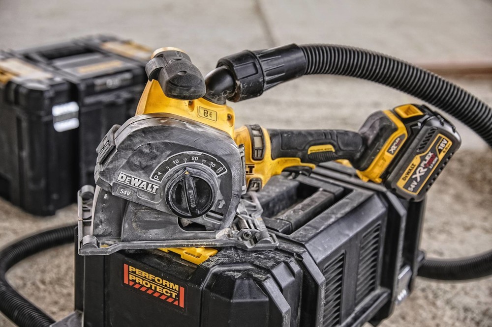 Die ergonomische Form und die gummierten Griffe ermöglichen zusätzlich eine perfekte Maschinenkontrolle und sorgen für ein ermüdungsarmes Arbeiten – alles ohne störende Kabel. Die bürstenlose Mauernutfräse DCG200 kann mit DEWALTs AirLock-System problemlos an Sauger wie bspw. dem 54V Akku-Nass-/Trockensauger (M-Klasse) DCV586MK-XJ angeschlossen werden. Die Ein-Knopf-Kopplung „Wireless tool control ready“ ermöglicht dem Nutzer eine automatische, kabellose Aktivierung dieses Saugers beim Einschalten der Maschine.