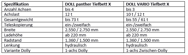 „Noch intelligenter. Noch ergonomischer. Noch sicherer.“: Der Slogan zur Markteinführung bringt die Kernpunkte der Neukonstruktion auf den Punkt. Beispiel DOLL EEP: Das exklusive Assistenzsystem („elektronische Einspurung postionsunabhängig“) punktet mit dem vollautomatischen und positionsunabhängigen Einspuren der neuen Tiefbetten. Der Auflieger wird damit nach dem Lenkvorgang eingespurt, ohne die Zugmaschine erst gerade ziehen zu müssen. Vielmehr ermittelt die DOLL EEP den korrekten Lenkeinschlag der Fahrwerkachsen automatisch über den Abgleich des Knickwinkels zwischen Zugmaschine und Auflieger. Die Basis dafür bildet das intelligente Bedien- und Steuerungssystem DOLL tronic, mit dem sich alle Trailerfunktionen über separate Keypads am Heck und Schwanenhals ausführen lassen.