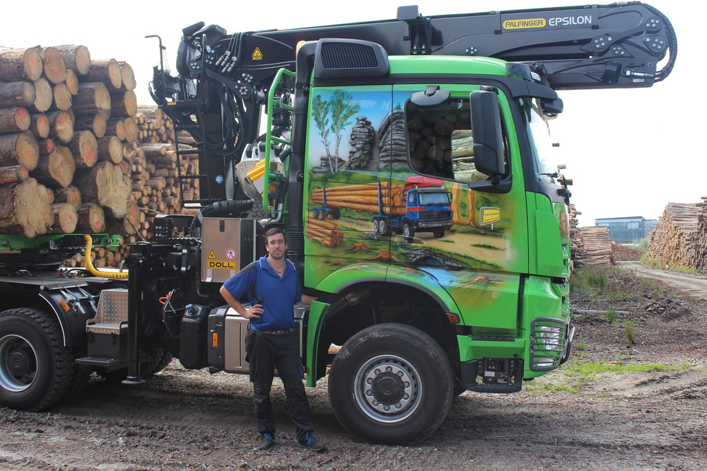 Dass der 6x6-Sattelzug die Erwartungen erfüllt, kann Fahrer Johann Schiller schon nach den ersten Einsatzwochen bestätigen. „Ich bin teilweise in extrem unwegsamem Gelände unterwegs. An Stellen, an denen vorher mit dem 6x4 nichts mehr gegangen wäre, geht es jetzt mit dem 6x6 immer noch weiter – wenn´s sein muss, auch rückwärts steile Waldwege hoch.“ In seinem Arocs-Fahrerhaus schätzt er außerdem das komfortable DOLL-Bedienfeld mit angeschlossener Kabelfernbedienung. „Ich kann damit die wichtigsten Funktionen vom Fahrersitz aus steuern, darunter Achslenkung, Arbeitsscheinwerfer, Aufliegerbremse und Rahmenverriegelung. Die Bedienung ist sehr benutzerfreundlich und auf der Mittelkonsole vom Lkw auch gut platziert.“