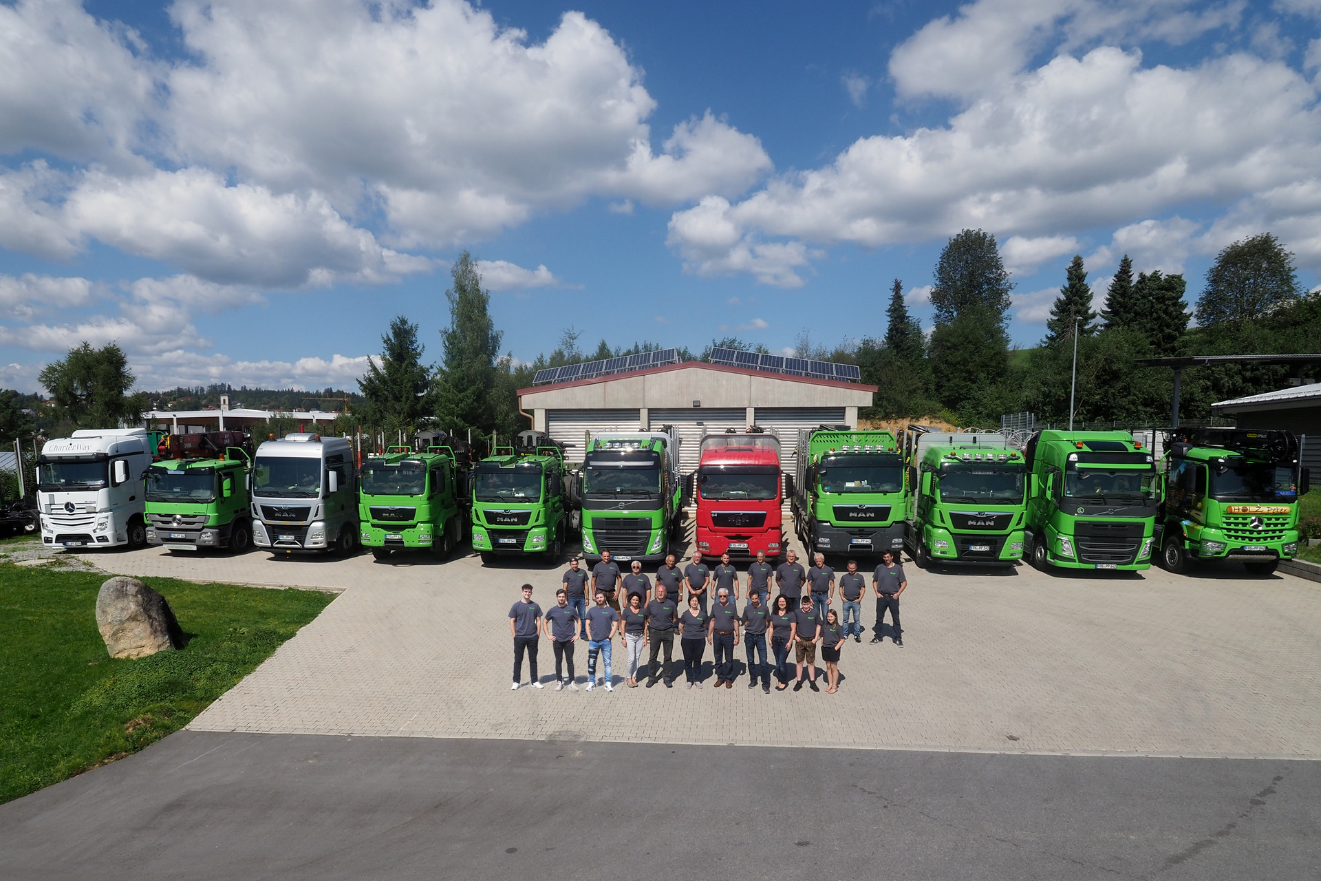 Elf Komplettzüge umfasst der Fuhrpark der Holz-Peter OHG. Ganz rechts: Der neue, Ende August in Dienst gestellte Arocs 6x6 mit Aufbau und Auflieger LOGO 20 von DOLL.