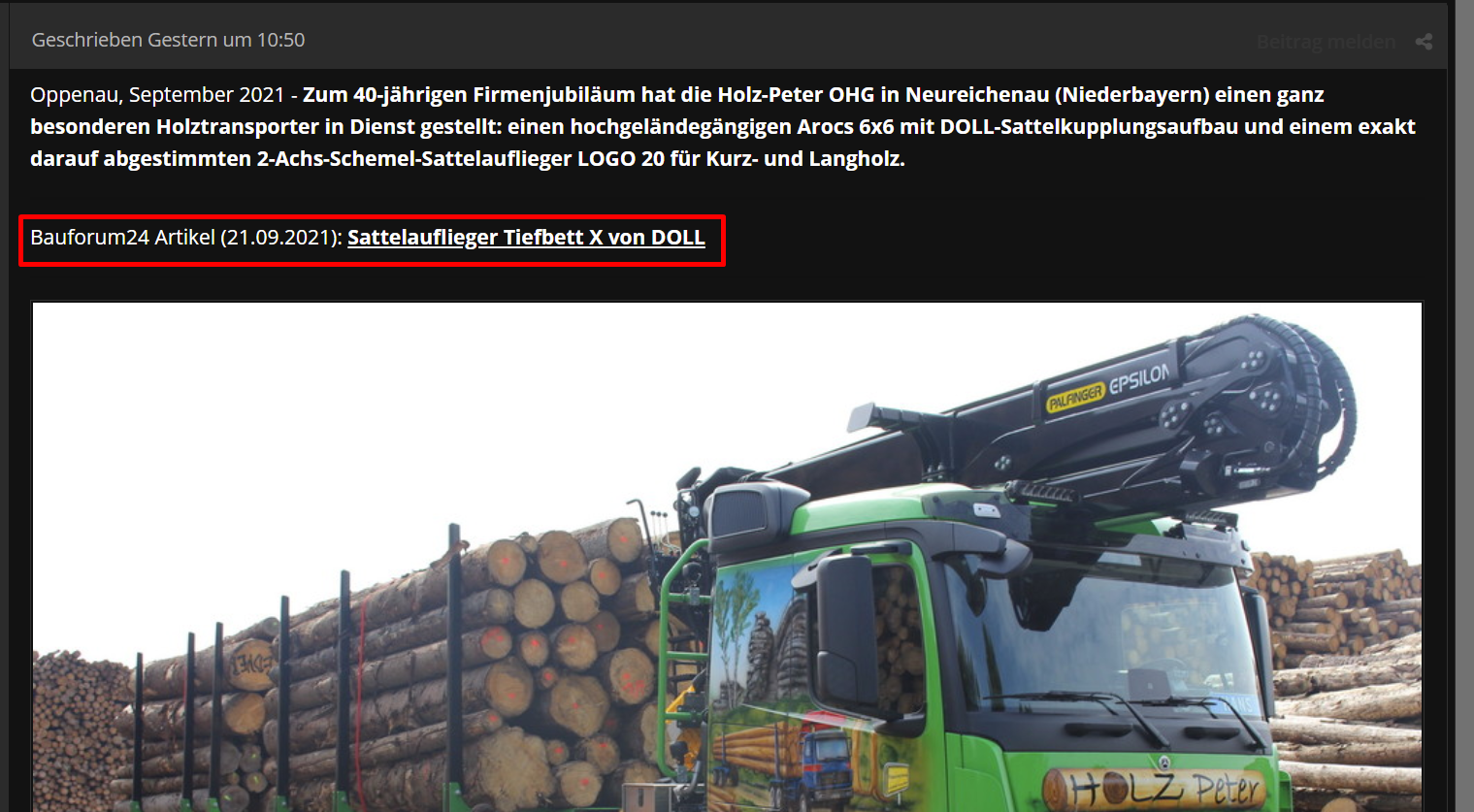 Bauforum24 Artikel (21.09.2020): Sattelauflieger Tiefbett X von DOLL