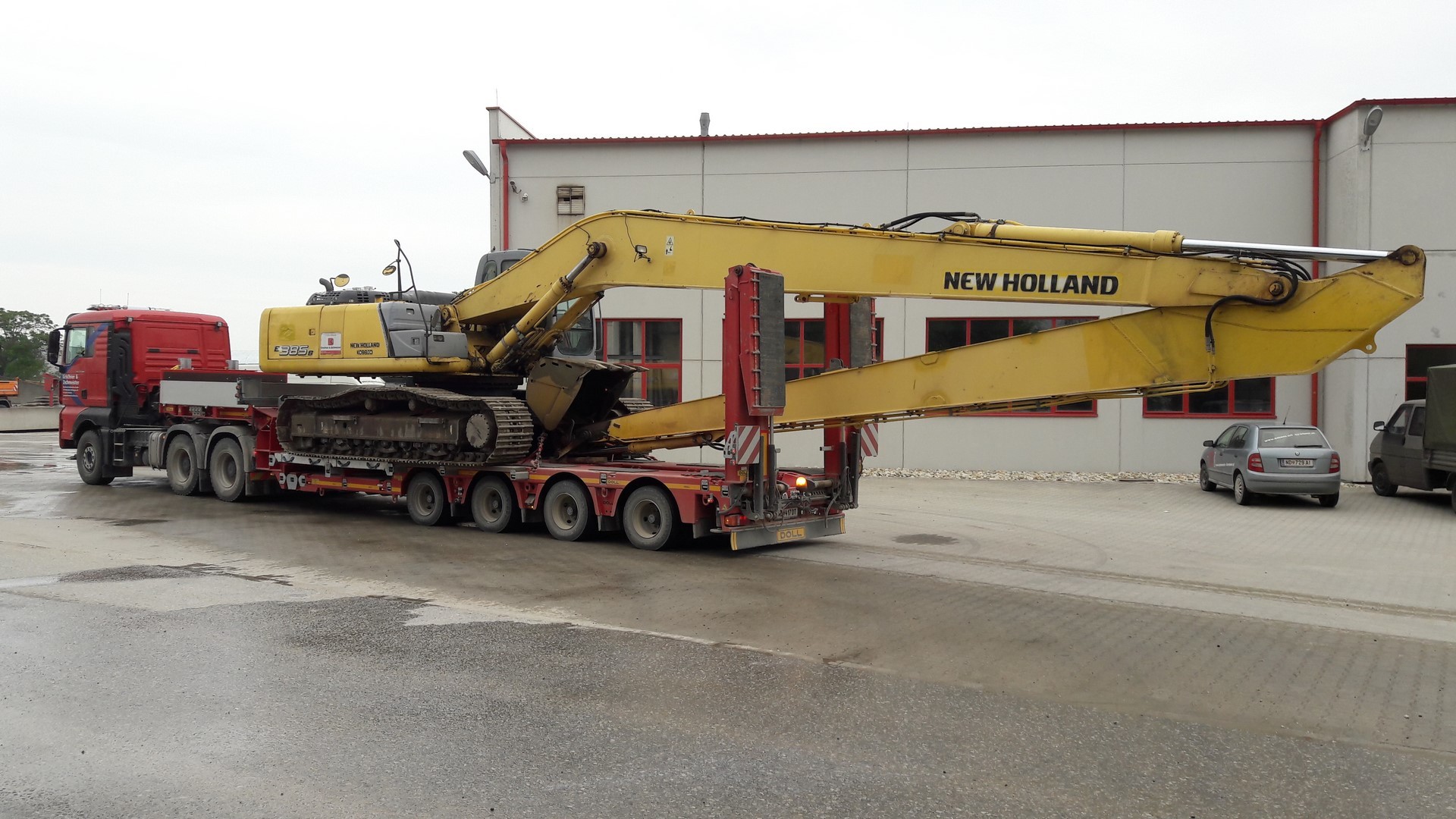 Geht es mit dem überlangen New Holland Kettenbagger auf Tour, werden die Verladeschienen als durchgängige Tiefladeplattform eingesetzt