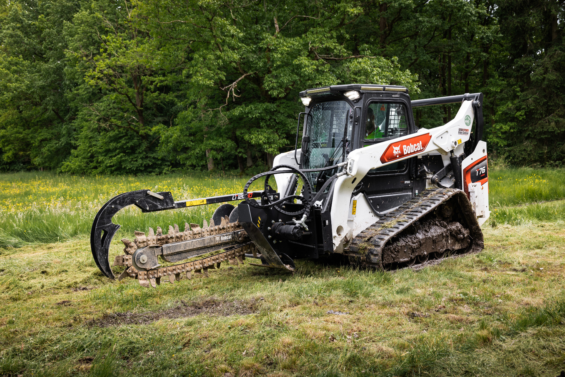 Die neuen Bobcat-Grabenfräsen sind mit einem leistungsstarken Grabenräumsystem ausgestattet, das für saubere Ergebnisse ohne Nacharbeit sorgt: Ein robuster, federbelasteter Grabenräumer bleibt konstant in Kontakt mit dem Grabenboden und entfernt den Aushub gründlich – für einen präzise geformten, fertigen Graben in einem Arbeitsgang. Bei Nichtgebrauch lässt sich der Grabenräumer platzsparend nach oben klappen. Für anspruchsvolle Einsätze liefert der kraftvolle Planetenantrieb hohes Drehmoment und maximale Leistung – ideal für harte Bodenverhältnisse. Gleichzeitig sorgt das Antriebssystem für hohe Langlebigkeit, reduzierte Wartungskosten und optimale Gesamtleistung im täglichen Einsatz.