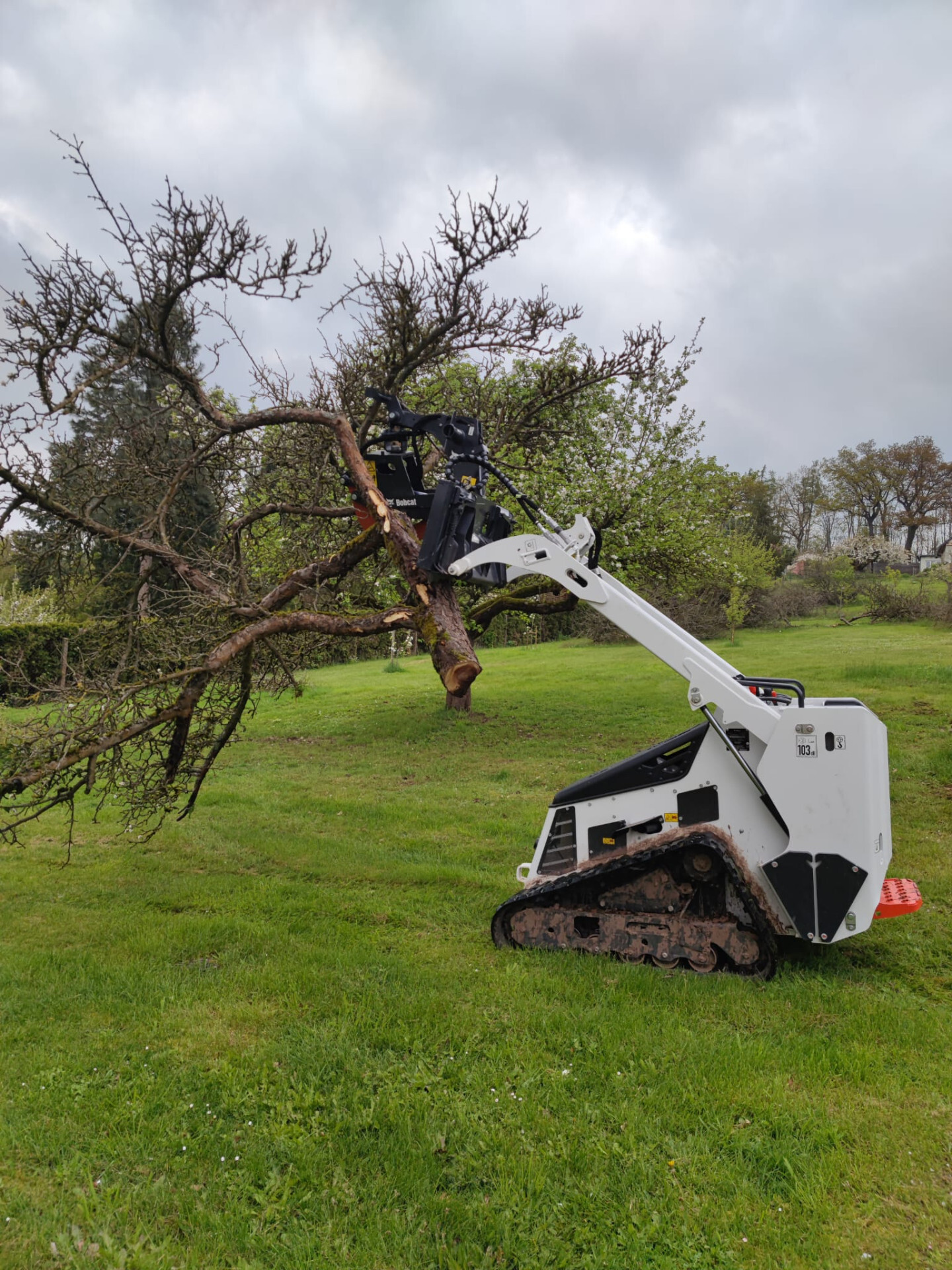 Der Bobcat MT100 mit Baumschere-Anbaugerät– dank kompaktem Raupenfahrwerk auch auf empfindlichem Untergrund wie Rasenflächen problemlos einsetzbar.