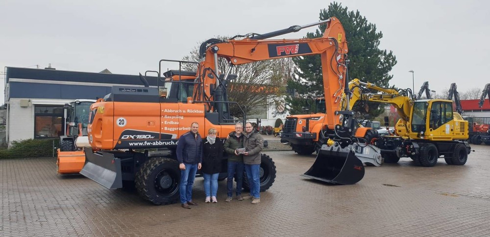 Übergabe des neuen Doosan DX190W: Carsten Gröbitz, Ina Wessel, Bernd Desenberg, Felix Wessel (von links)