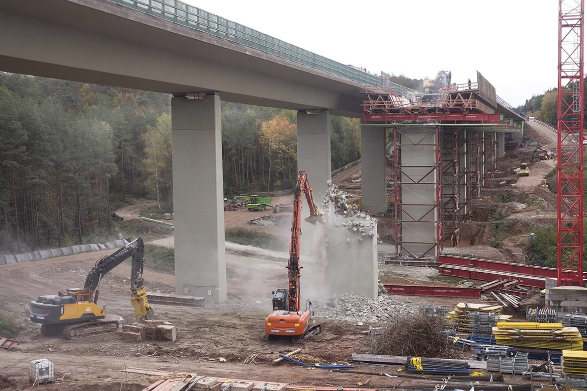 Im ersten Abschnitt wird das westliche Bauwerk (Fahrtrichtung Kassel – Würzburg) komplett abgebrochen, also Überbau und Pfeiler, Fundamente und Widerlager. Sebastian Wess vom ausführenden Unternehmen Wende schildert die Herausforderungen bei diesem Projekt: „Wir müssen insgesamt rund 20.000 t Stahlbeton entfernen. Zudem ist der zerkleinerte und aufbereitete Beton bereits fest in unserer betrieblichen Stofflogistik eingeplant. Außerdem arbeiten wir unter Zeitdruck. Denn parallel zum Abbruchfortschritt wird bereits die neue Brücke gebaut.“