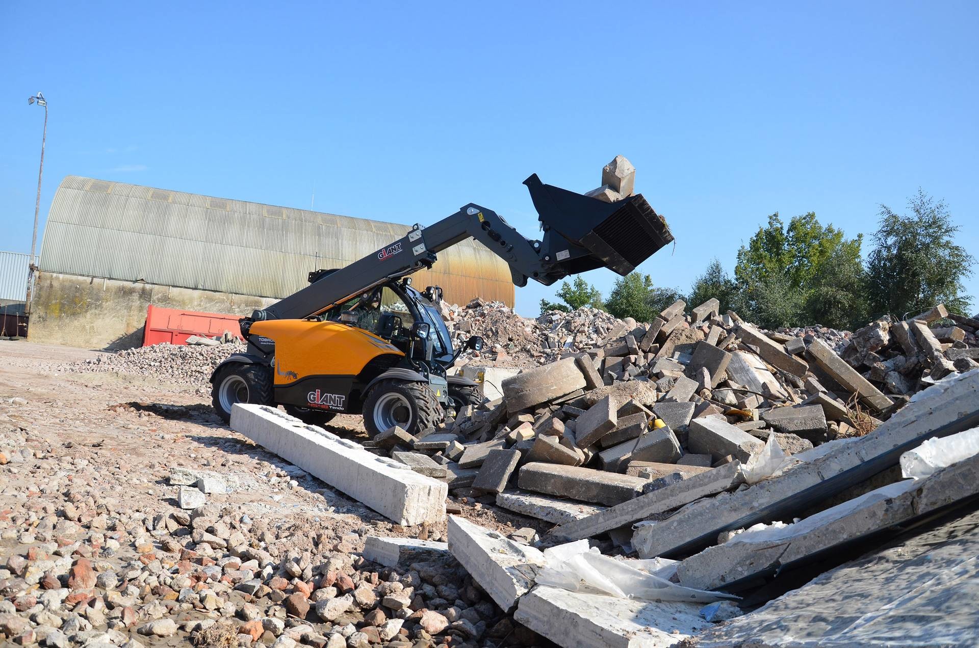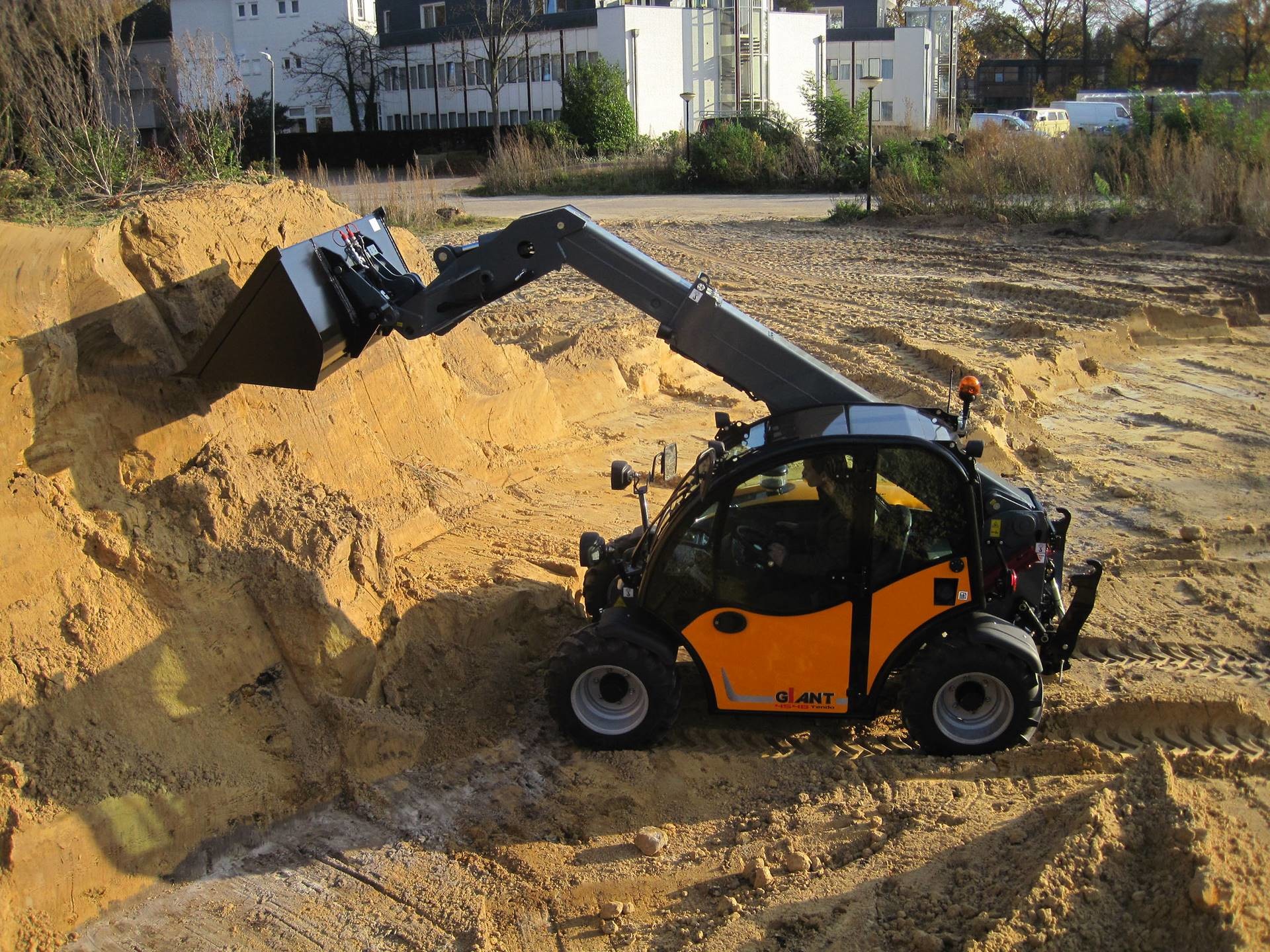 Der 4548 Tendo HD von Giant ist ein vielseitiger Teleskoplader. Er weist alle Eigenschaften eines Radladers auf, kann darüber hinaus jedoch noch mehr: Die Maschine ist aufgrund ihrer kompakten Bauweise dafür konstruiert, auf engstem Raum zu arbeiten und zu manövrieren, dabei zeigt der Tendo Dank seines ungeteilten Fahrzeugrahmens und der Allrad-Lenkung die beste Standsicherheit seiner Klasse. Mit einer Kabinen-Gesamthöhe von knapp unter zwei Metern und einer Breite von 1,60 Metern gelangt er ohne Probleme durch schmale Eingänge und Grundstücksdurchfahrten und kann so beispielsweise bei Neu- und Umgestaltungen von Gärten in Hinterhöfen eingesetzt werden.