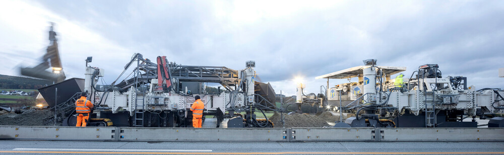 „Für uns ist dies ein echter Meilenstein, weil wir hier CEM II/A-LL 42,5 N erstmals auch für den Oberbau einsetzten. Weiteres Novum: Die Deckschicht wird gegrindet“, erklärt Philipp Zenger, zuständig für Produktmanagement Verkehrswegebau von Heidelberg Materials. Dies sei wichtig, um die Lärmemission zu vermindern und die Fahrbahnoberfläche durch die Verbesserung der Ebenheit zu entlasten, was die Erhaltungskosten minimiert und den Nutzungszeitraum verlängert.