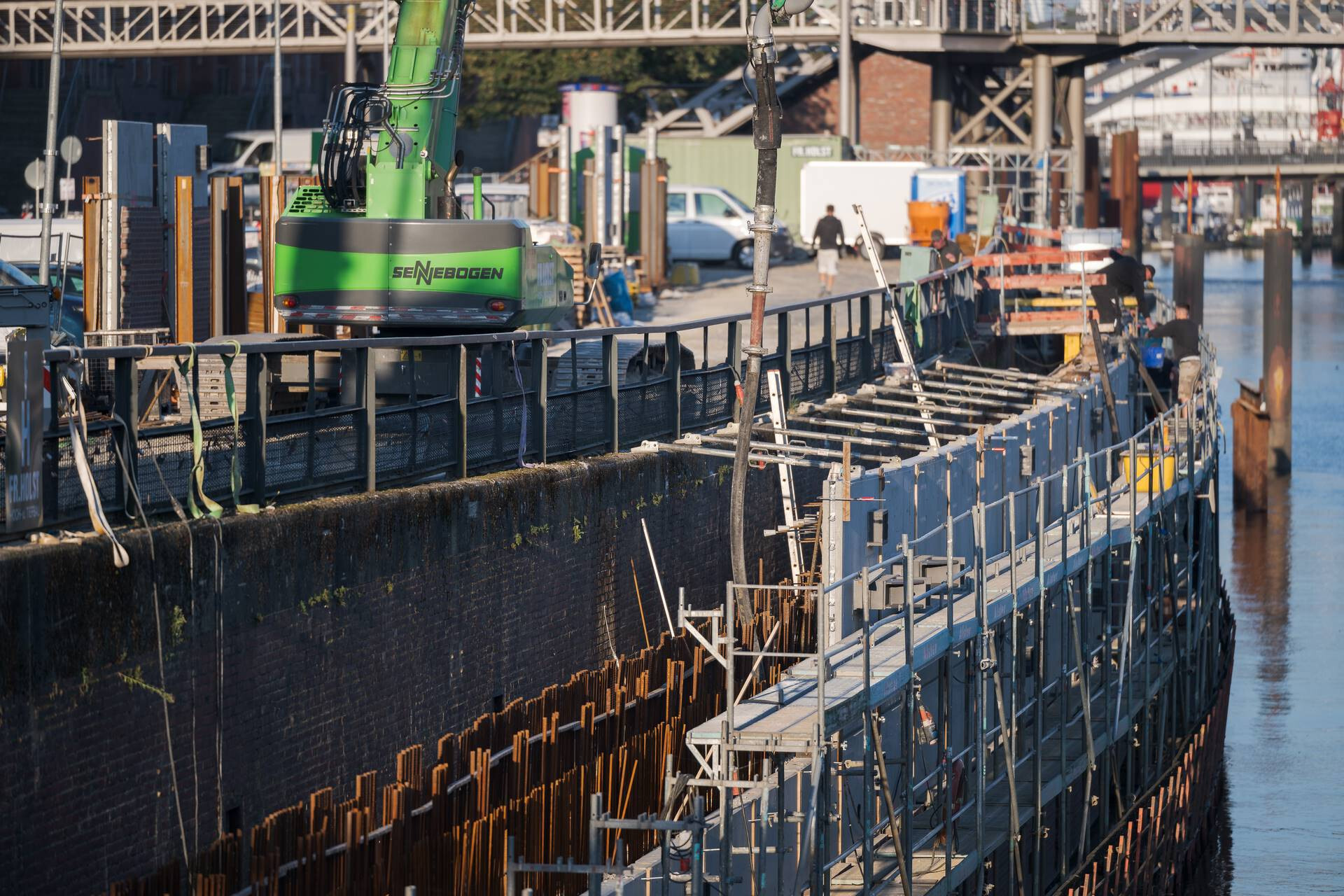 Um die Sicherheit der Uferlinie und der darüberliegenden Gebäude zu gewährleisten, wurde eine neue, vorgesetzte Spundwand errichtet. Diese zeitgemäße Konstruktion übernimmt nun die Ufersicherung, während die beiden alten Wände außer Funktion gesetzt wurden.