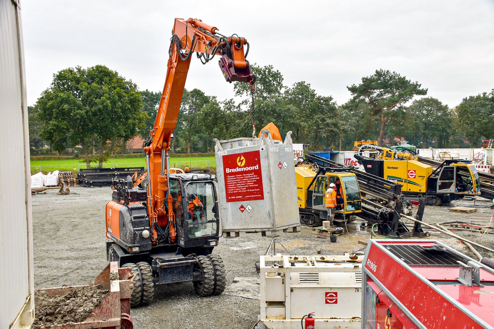Dass von dem agilen 15-Tonner viel erwartet wird, zeigt sich schon am mitgeorderten Equipment. Neben mehreren Löffeln kommen beispielsweise eine Kette mit Haken zum Einsatz. Aufwendiger sind Schlauch-/Kabelhaspel sowie eine Palettengabel. Da wird der angebaute OilQuick-Schnellwechsler zum unverzichtbaren Accessoire, der im Minutentakt wechselt. „Dazu erweitert ein OilQuick-Tiltrotator-Sandwich die Möglichkeiten ganz wesentlich, den wir aus unserer reichhaltigen Palette kurzfristig nachrüsten konnten,“ erklärt Kiesel-Nord-Mietparkleiter Nic Hofschröer. Neben Vielseitigkeit ist aber auch Präzision in ebensolcher Verlässlichkeit gefordert, wie Bauleiter Uwe Seeliger betont: „Wenn zwischen den exakt ausgerichteten Bohranlagen neue Gestänge zugeführt werden müssen, ist Höchstleistung gefragt.“ Die gefüllte Gestängebox zum Austausch mit den Abmaßen von 6,5 Meter Länge und ca. 2,5 Tonnen Last, muss zum Teil mit gestrecktem Arm aufgelegt werden. „In so einem Moment darf einfach nichts schiefgehen,“ weiß Seeliger, „sonst steht der Vortrieb.“ Ähnliches gilt für die Kraftstofftanks der zahlreichen Aggregate, mit der sich die Baustelle weitgehend autark hält. Sie werden am Haken von und zur zentralen Tankanlage gefahren.