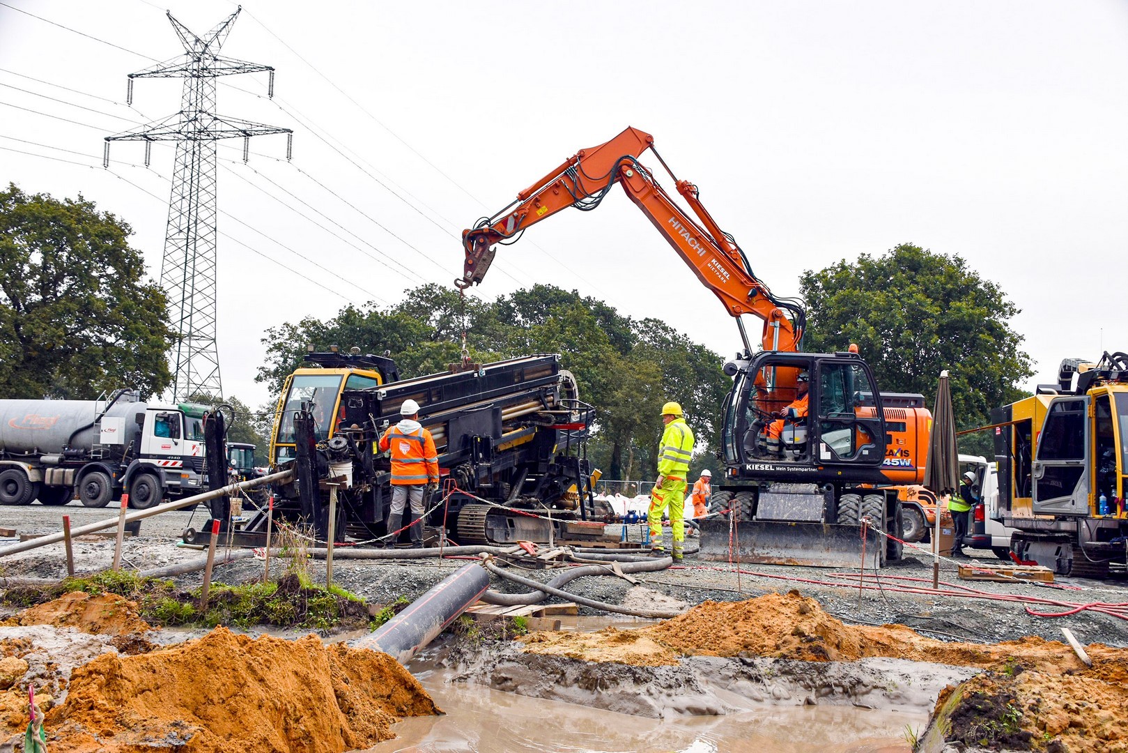 Leistungsstarke Bohrgeräte arbeiten sich mit bis zu 550 Millimeter mächtigen Aufweitungsbohrern und gezogenen sogenannten Räumern jeweils bis zu einem Kilometer durch den lehmigen Untergrund. Flankierend bereitet eine umfangreiche Anlagentechnik den Bohrschlamm auf. Der Hitachi ZX145W muss tagtäglich flexible Tugenden unter Beweis stellen, denn: Auch und grade große Projekte brauchen kleine Helferlinge, auf die sich die gesamte Crew verlassen kann. Da ist ein zuverlässiger beweglicher Alleskönner gefragt. Nach dem Motto: Aufsteigen – anmachen – los geht’s! ist der Hitachi ZX145W permanent gefordert.