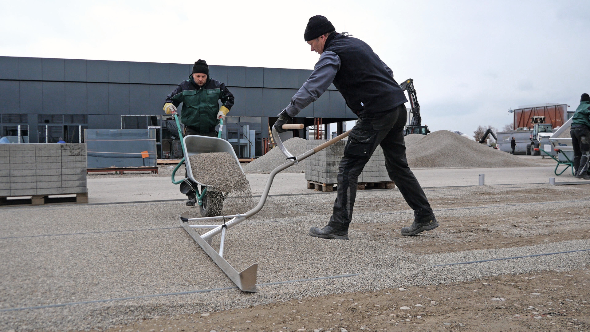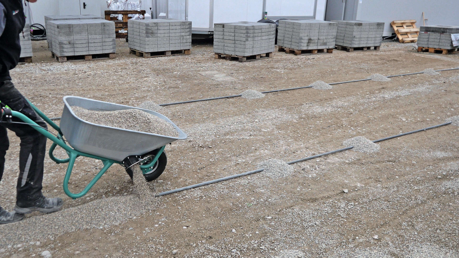 Die Grundidee ist einfach: Splitt wird nicht mehr mühsam mit der Schaufel bewegt, sondern direkt aus der Schubkarre dosiert. So gelangt das Material in der gewünschten Menge genau dorthin, wo es gebraucht wird. Auf diese Weise lassen sich Abziehrohre ergonomisch einrichten und Flächen mit ca. 100 m² pro Stunde vorbereiten.