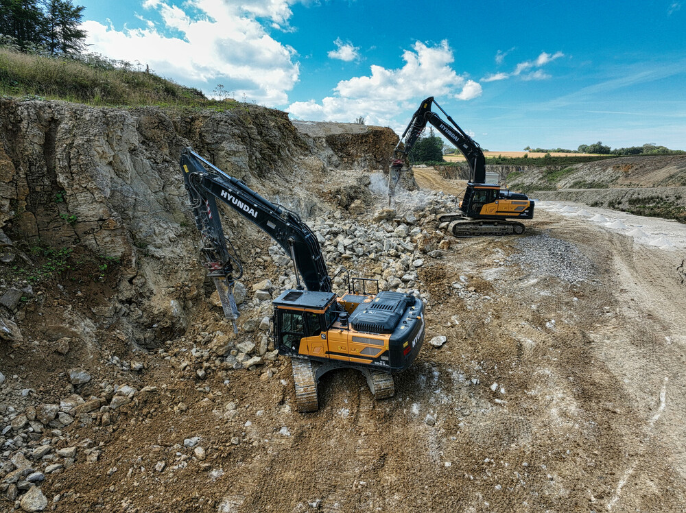 Im umfangreichen Maschinenpark bewähren sich seit 6 bzw. 18 Monaten zwei Hyundai-Kettenbagger HX300A NL, geliefert und betreut vom HD Hyundai Vertragshändler Engelhardt Baumaschinen aus Schopfloch. Eingesetzt werden die mit 6.250 mm-Monoblock und 3.050- mm-Stiel bestückten Bagger zum Knäppern von Material sowie für Ladearbeiten. Weitere Hyundais im Fuhrpark sind je ein Radlader HL770 9A. Für spezielle Arbeiten an den Brech-,Sortier- und Aufbereitungsanlagen setzt man einen neuen Hyundai-Mobilbagger HW170A CR ein.