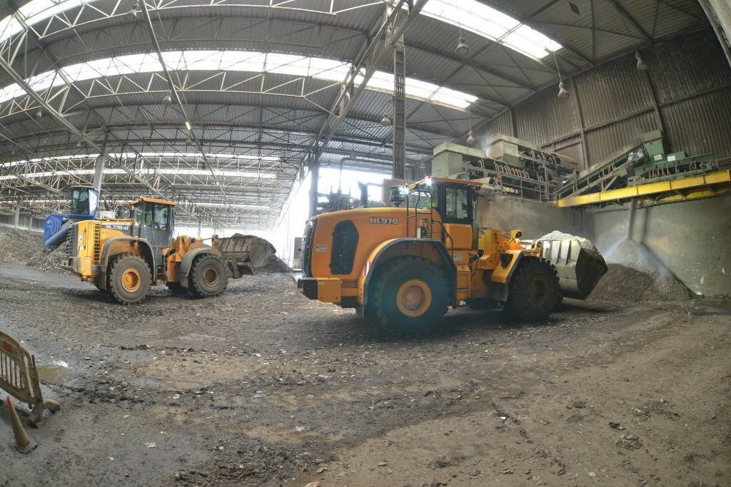 Ihre Aufgabe ist es, das Material im Aufbereitungsprozess umzusetzen und zu verladen. Der Hausmüll wird vorzerkleinert und in einer Siebtrommel auf < 80 mm gesiebt, anschließend verweilt er in der Intensivrotte fünf Wochen (44 Tunnel á 220 Tonnen Kapazität). Während der Rotte wird der Müll zwei Mal umgesetzt bei Reinigungsarbeiten kommt ein Hyundai Skidsteer-Lader mit Kehrmaschine und komplett schließbarer Kabine und Seka-Schutzbelüftungsanlage zum Einsatz. Die Nachrotte wird von den Radladern beschickt – ein Mietenumsetzer bewegt das aufgehäufte Material regelmäßig.