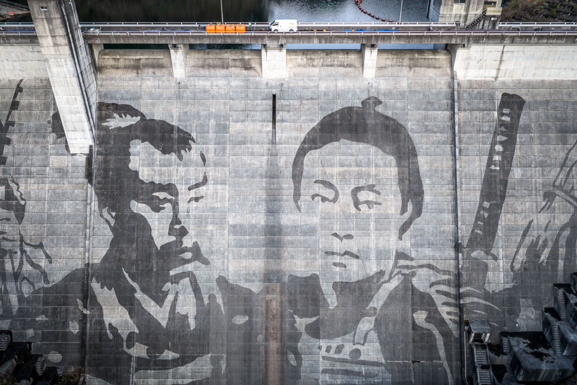 Der Künstler Klaus Dauven betont die historische Dimension seiner Arbeit: „Mein Verhältnis zu dem Matsudagawa Dam ist ein Besonderes: Dort habe ich gemeinsam mit Kärcher im Jahr 2008 mein erstes Staumauer-Reverse-Graffiti im Ausland realisiert. Jetzt, 18 Jahre später, sind wir wieder zurückgekehrt, um den Staudamm erneut zu verwandeln. Als Motiv habe ich vier Porträts von Samurai ausgewählt, die ich von ca. 150 Jahre alten Fotos abgezeichnet und übernommen habe. Sie beziehen sich einerseits auf die historische Tradition der Samuari, die in der nahegelegenen Stadt Ashikaga tief verwurzelt ist. Andererseits faszinieren mich deren Anmutung und ihr Gesichtsausdruck, die von tiefer Menschlichkeit geprägt sind.“