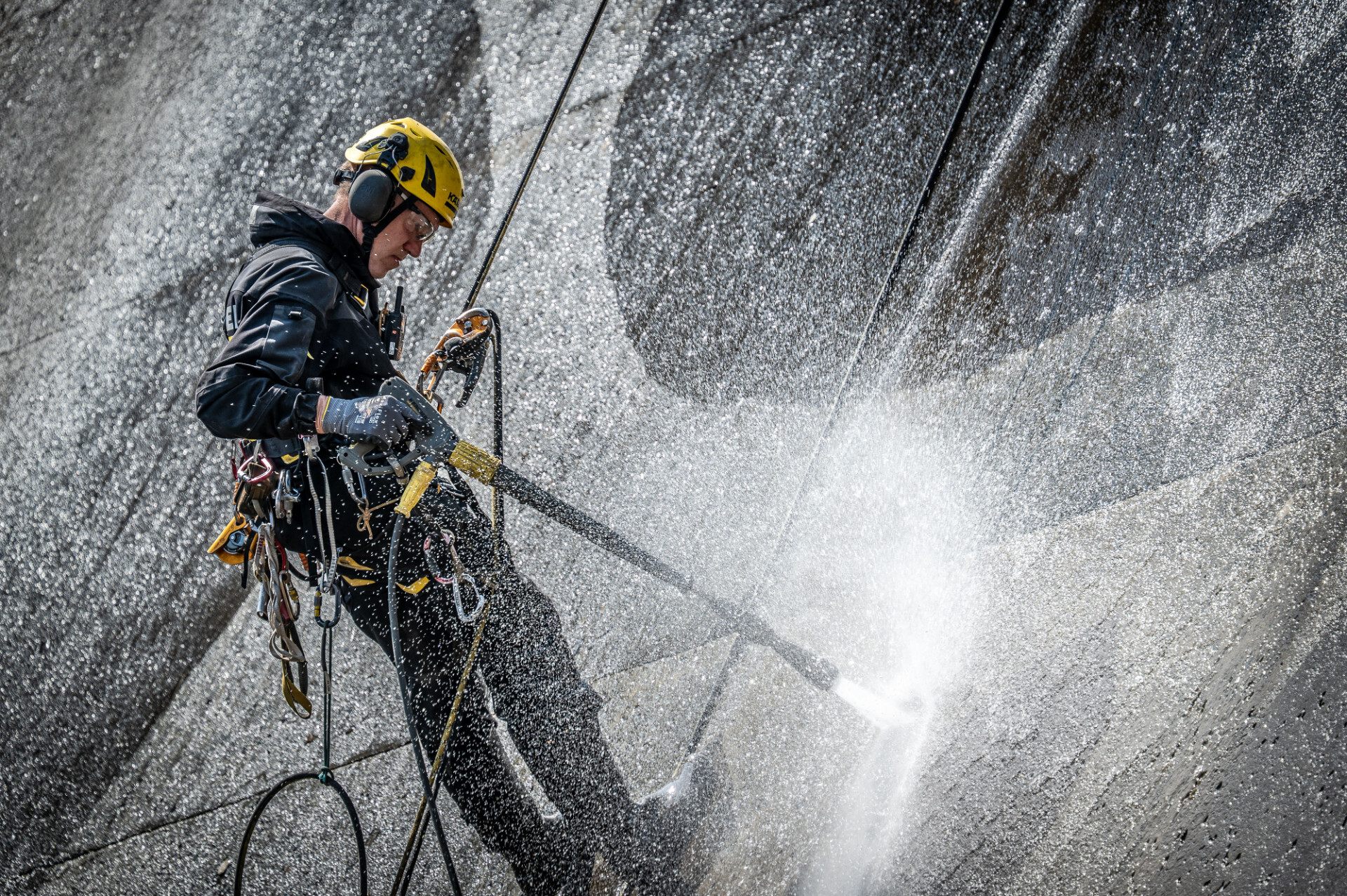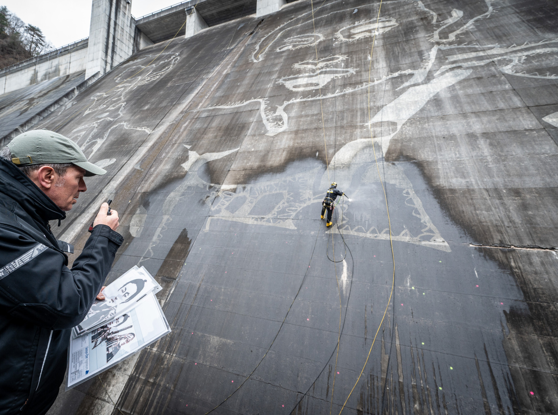 Für die Umsetzung hat Kärcher ein Team aus Spezialisten aus Deutschland zusammengestellt. Unter der Leitung des Kärcher-Projektmanagers Nick Heyden arbeiten Seilzugangstechniker und Vermessungstechniker Hand in Hand mit dem Künstler, um das Motiv auf die steile Wand zu bringen. Die Reinigung erfolgt dabei rein mechanisch mit Wasser und ohne jegliche chemische Zusätze, was eine äußerst geringe Umweltbelastung sicherstellt. Die Hochdruckreiniger werden zudem mit Wasser aus dem Stausee betrieben, das im Anschluss am Fuß des Damms wieder in den Wasserkreislauf einfließt, was zusätzlich Ressourcen spart.