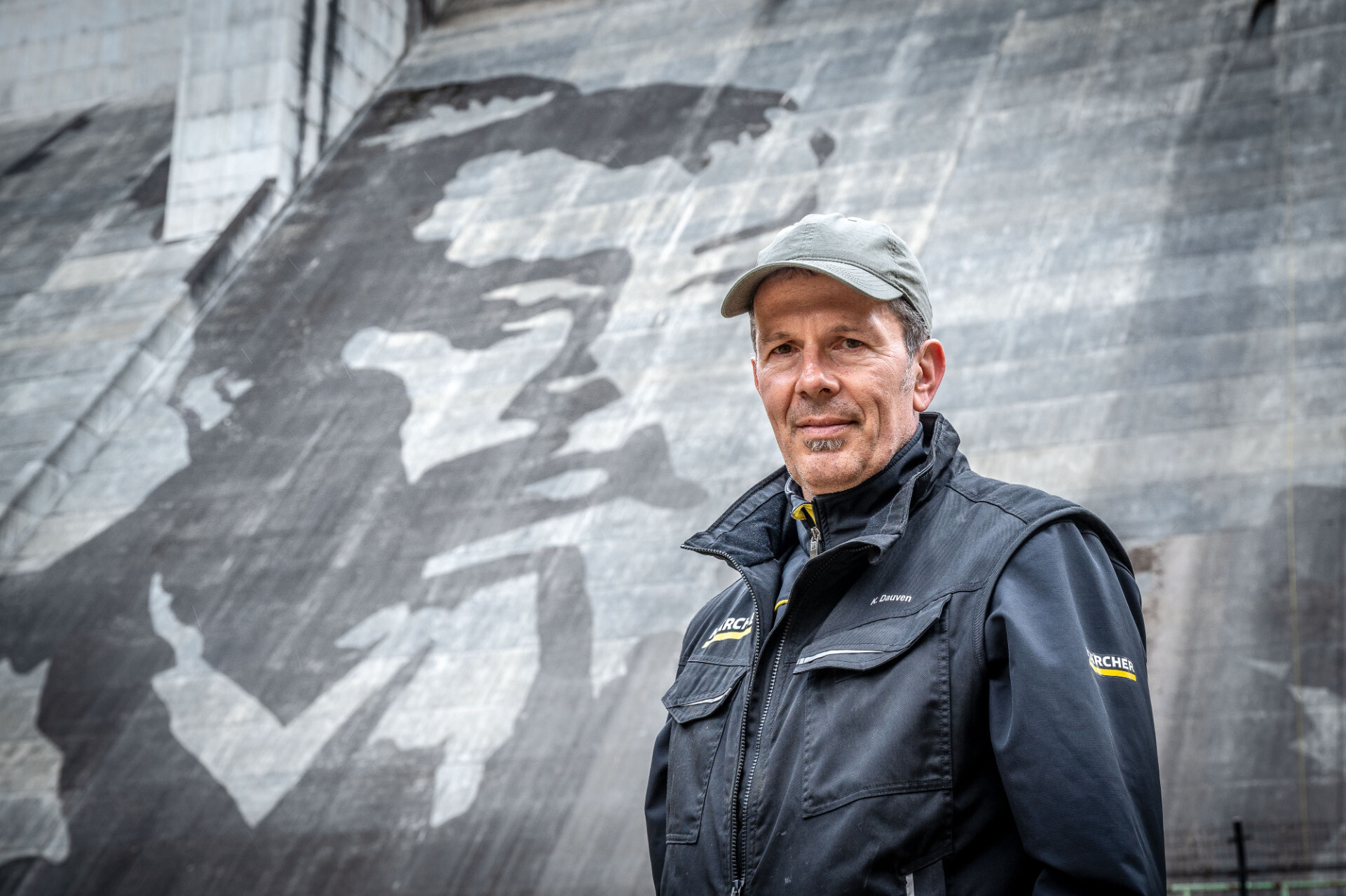 Unter der Leitung des Kärcher-Projektmanagers Nick Heyden arbeiten Seilzugangstechniker und Vermessungstechniker Hand in Hand mit dem Künstler, um das Motiv auf die steile Wand zu bringen. Die Reinigung erfolgt dabei rein mechanisch mit Wasser und ohne jegliche chemische Zusätze.